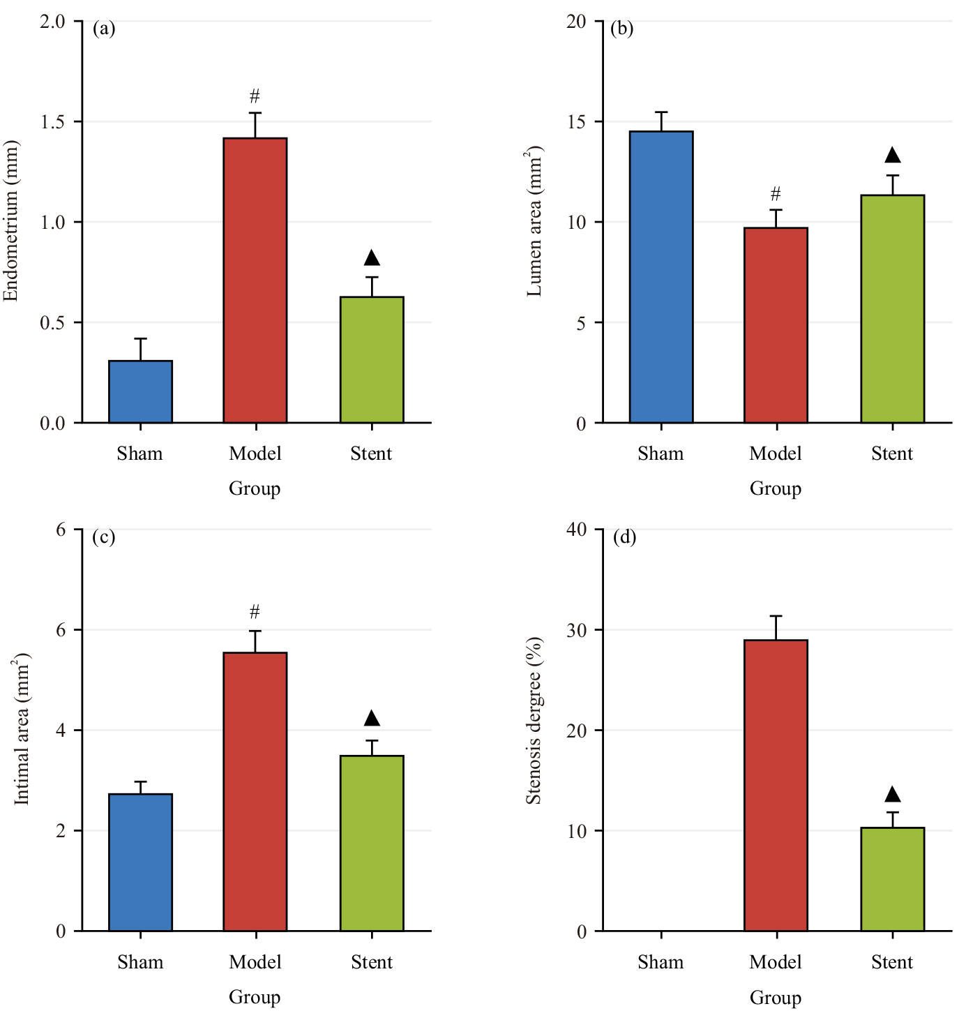 Fig. 6 shows the comparison of the intimal thickness (Fig. 6a), lumen area (Fig. 6b), intimal area (Fig. 6c) and degree of stenosis (Fig. 6d) across groups. The model group exhibited notably greater intimal thickness and area and considerably smaller lumen area relative to the Sham group (p
