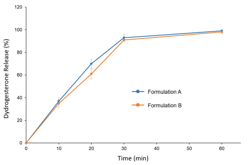 Fig. 3. Dissolution profile of dydrogesterone formulation A (blue line) and formulation B (orange line). Error bars indicate standard deviation (n = 6).
