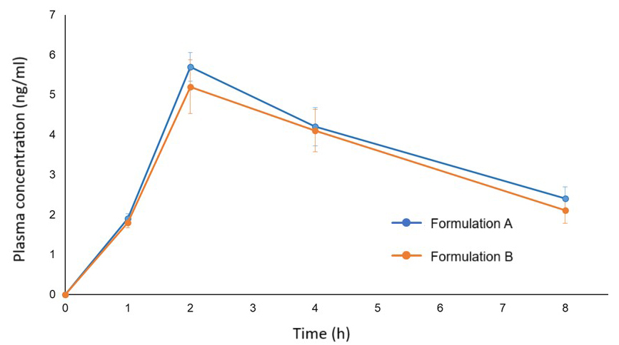 Fig. 4. Plasma dydrogesterone concentration vs time plot following oral administration of dydrogesterone formulation A (blue line) and formulation B (orange line) to rats (n = 5). Error bars indicate standard deviation.
