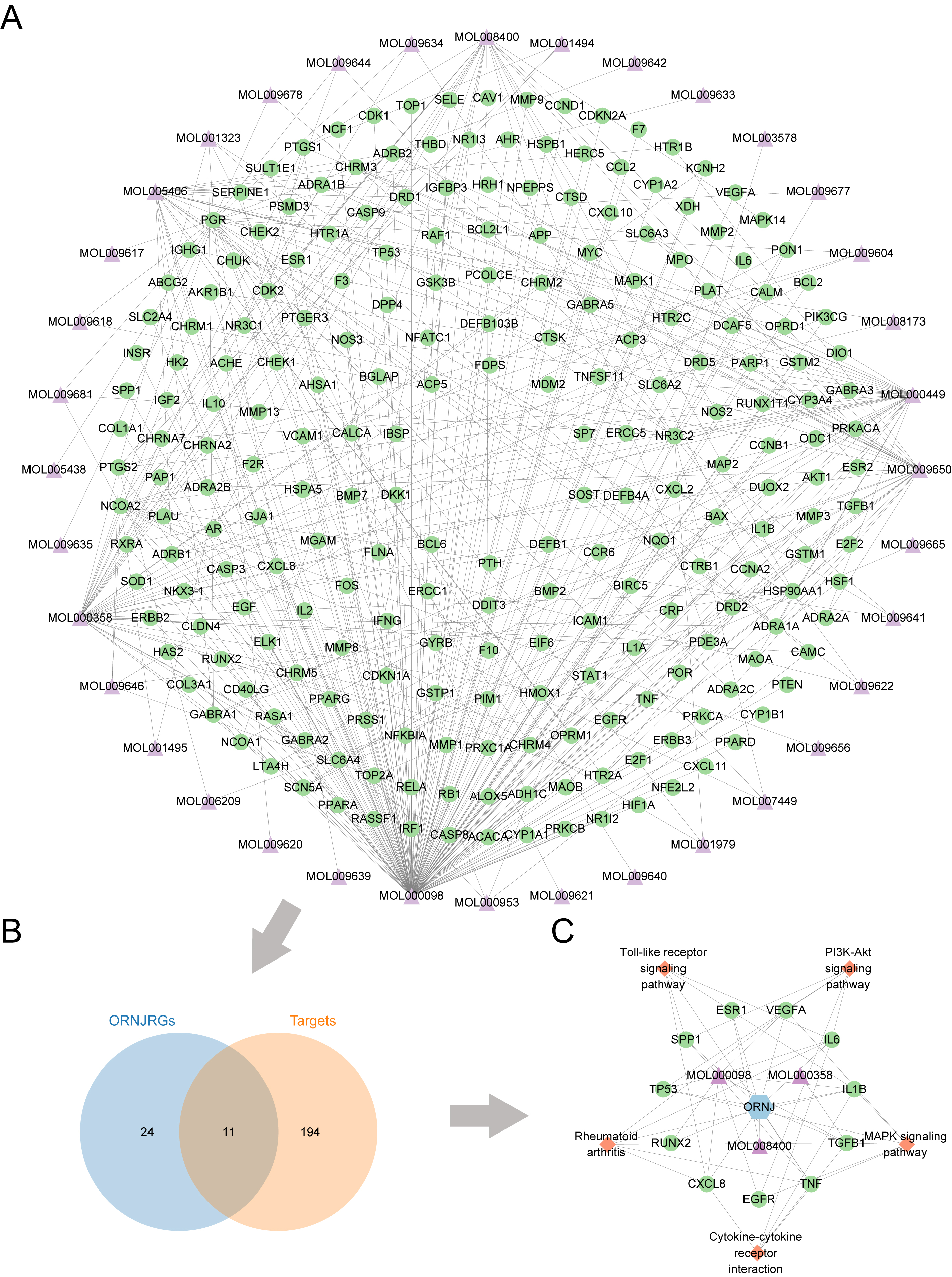 Fig. 2. Target screening for Lycium barbarum and ORNJ. (A) Network diagram of predicted targets of active chemical constituents in Lycium barbarum. (B) Venn diagram of the predicted targets of active components in Lycium barbarum and ORNJ-related genes. (C) Active chemical components, ORNJ-related genes, and the KEGG pathway network map for Lycium barbarum. ORNJ, osteoradionecrosis of the jaw; ORNJRGs, osteoradionecrosis of the jaw related genes; KEGG, Kyoto Encyclopedia of Genes and Genomes. In panels (A) and (C), the green circles represent mRNAs, purple triangles are chemical components, blue hexagons are ORNJ, and orange quadrangles are the KEGG pathways.
