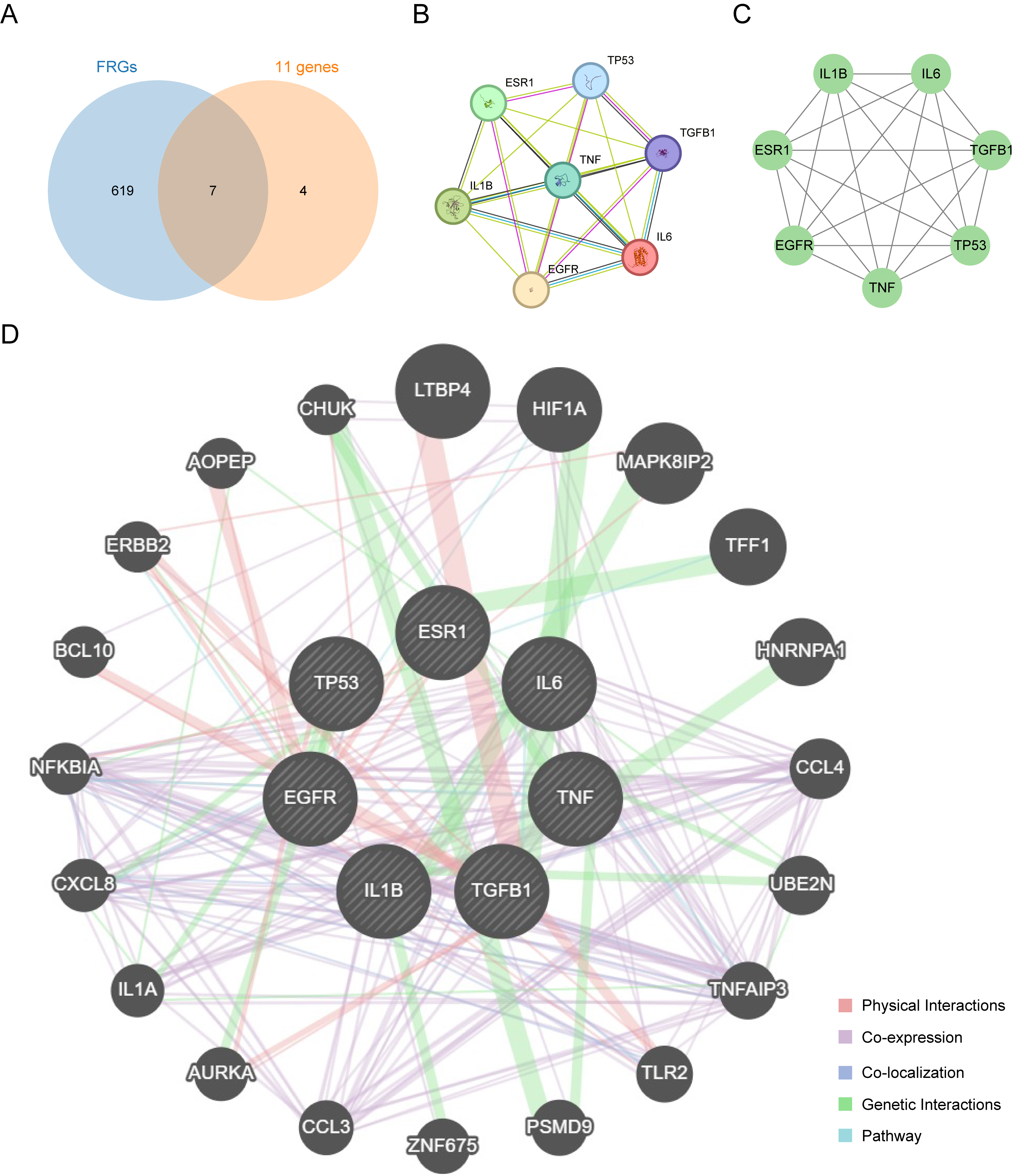 Seven intersection genes (TP53, EGFR, TGFB1, IL-6, IL1B, TNF, ESR1) were obtained from the intersection of FRGs and Lycium barbarum treatment ORNJRGs. These intersection genes were deemed as hub genes in the Venn diagram (Fig. 3A). Protein–protein interactions were examined in terms of the seven hub genes, resulting in the creation of a protein–protein interaction network (Fig. 3B), visualized through Cytoscape (Fig. 3C). Furthermore, for each of the seven hub genes, an interaction network of functionally related genes was predicted and built using the GeneMANIA website (Fig. 3D). This allowed the physical interactions, shared protein domains, gene interactions, and other relevant information for the hub genes to be observed.
