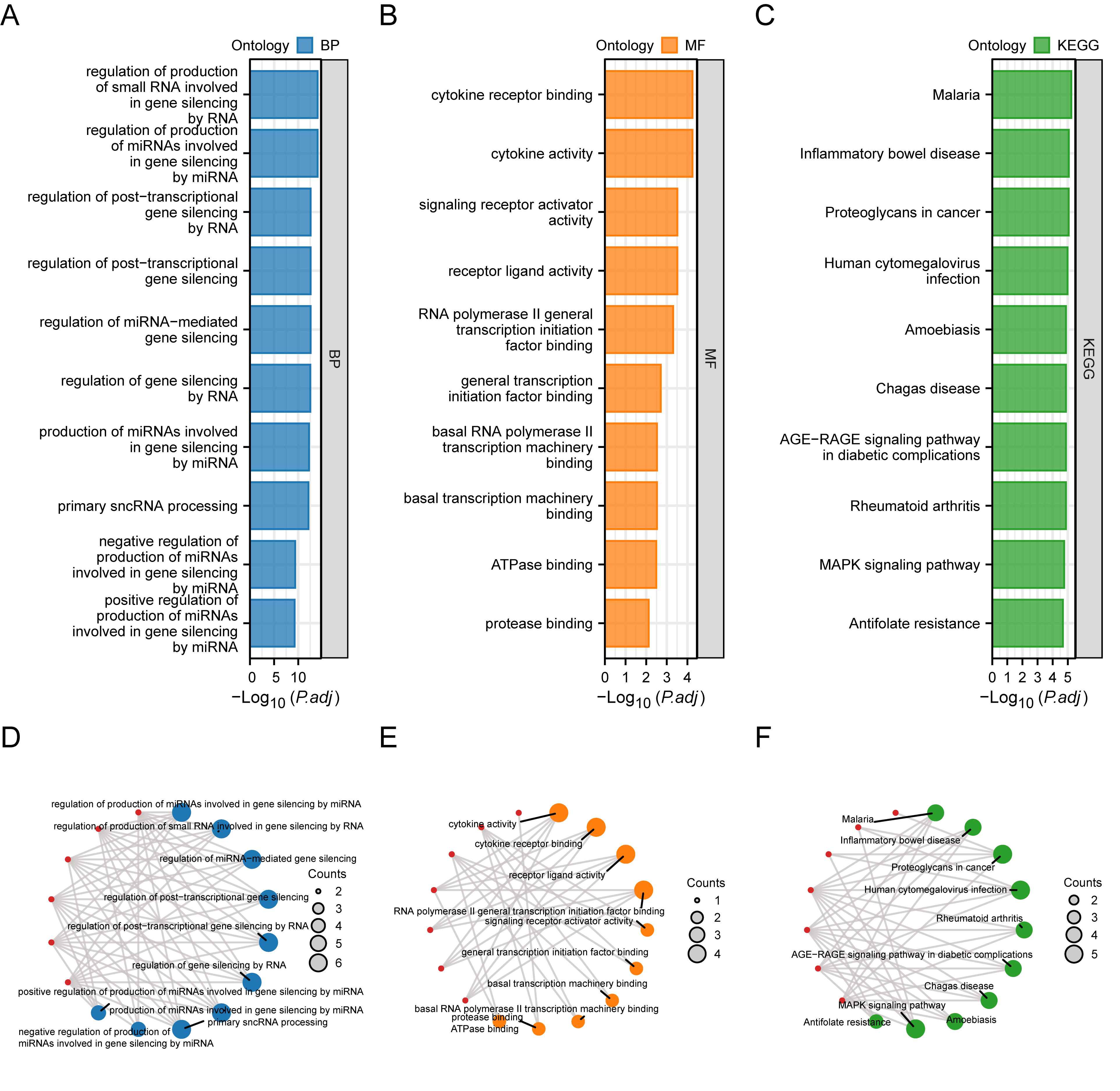 As shown in Fig. 4A–F, the hub genes were mainly enriched in regulating the generation of miRNAs involved in gene silencing through microRNAs, small RNA generation involved in gene silencing through RNA, miRNA-mediated gene silencing, gene silencing through RNA, post-transcriptional gene silencing, post-transcriptional gene silencing through RNA, miRNA generation involved in gene silencing through miRNA, primary sncRNA processing, and the negative and positive regulation of the generation of miRNAs involved in gene silencing through miRNA. The regulation of other BPs included cytokine receptor binding, signaling receptor activator activity, cytokine activity, receptor ligand activity, RNA polymerase II common transcription initiation factor binding, common transcription initiation factor binding, basal transcription machinery binding, basal RNA polymerase II transcription machinery binding, and ATPase binding, as well as MFs such as protease binding. The hub genes were mainly enriched in malaria, inflammatory bowel disease, cancer proteoglycans, cytomegalovirus infection, rheumatoid arthritis, the Advanced Glycation End-products-Receptor for Advanced Glycation End-products (AGE-RAGE) signaling pathway in diabetic complications, Chagas disease, Amoebiasis, the MAPK signaling pathway, and antifolate resistance pathway (Table 2).