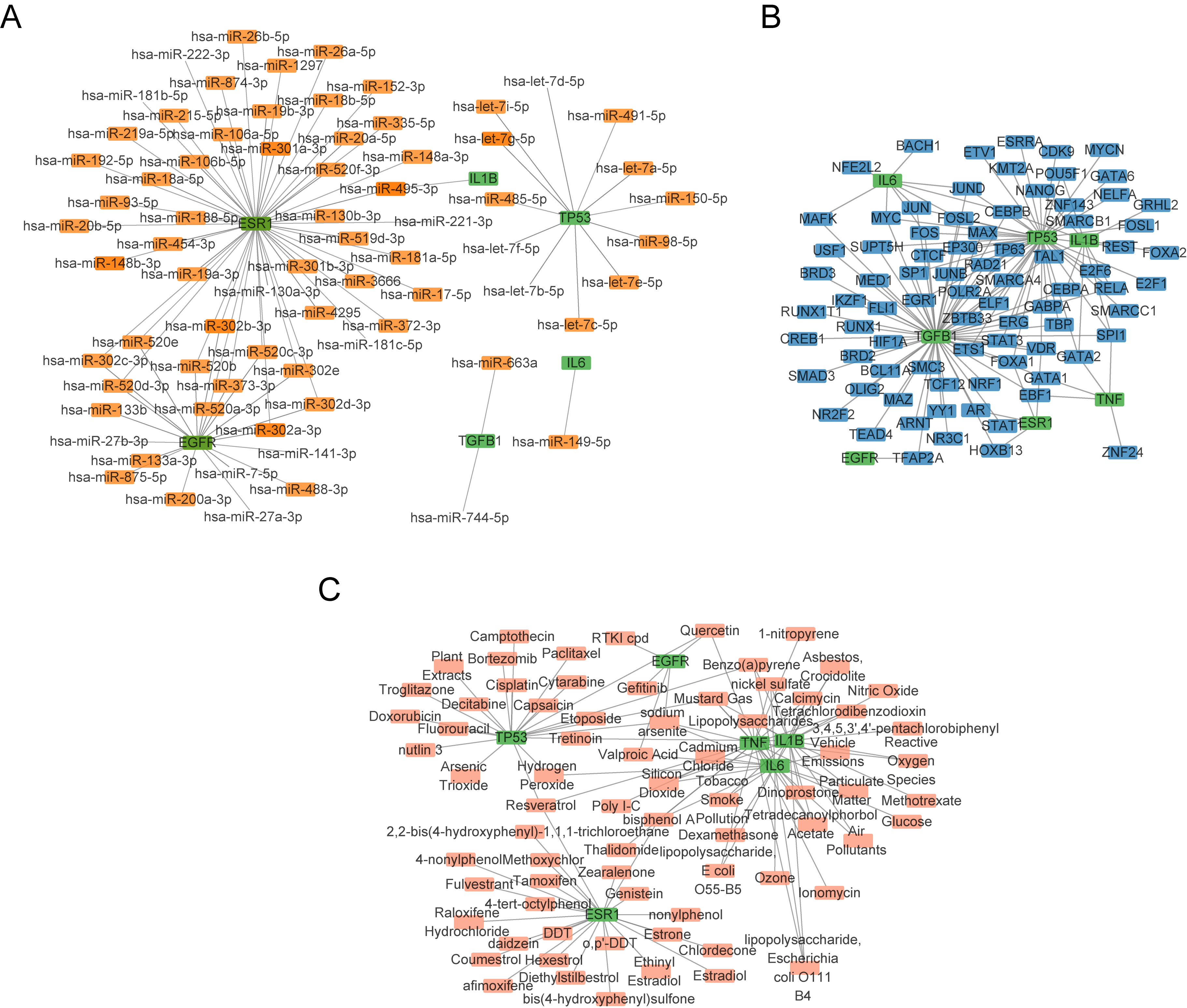 Fig. 5. Construction of mRNA–miRNA, mRNA–TF, and mRNA–drug interaction networks. (A–C) mRNA–miRNA (A), mRNA–TF (B), mRNA–drug (C) interaction networks of hub genes. Green squares are mRNAs; orange squares are miRNAs; blue squares are TFs; pink squares are small-molecule drugs. TFs, transcription factors.