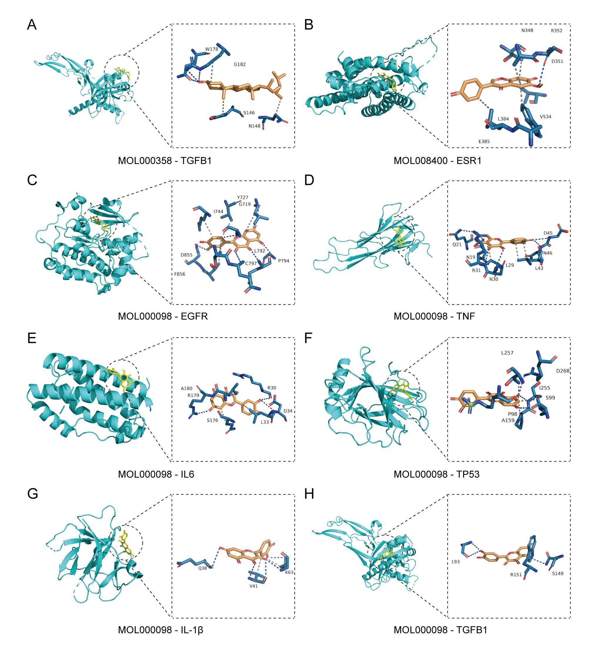 Fig. 6. Docking analysis of hub genes with core active components. (A) Mode of binding of Transforming Growth Factor Beta 1 (TGFB1) to