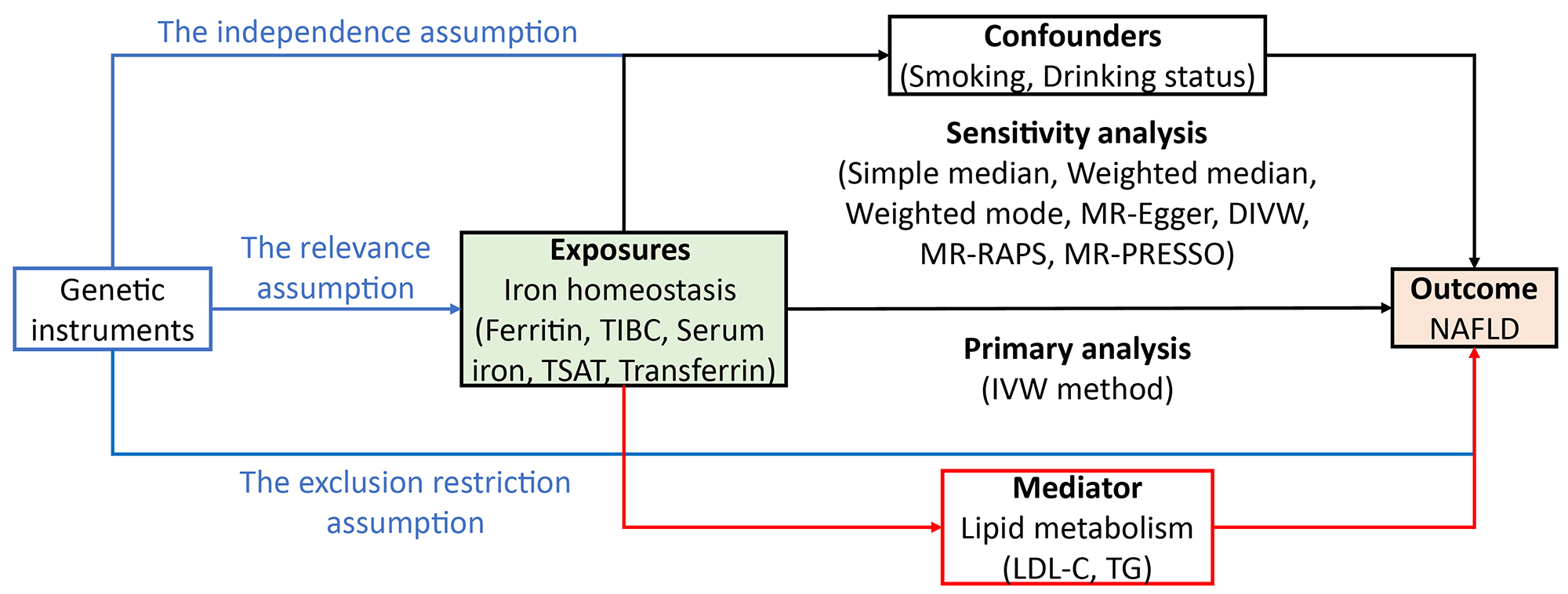 Observational epidemiological studies are limited by their susceptibility to confounding and reverse causation. An alternative approach that can address these challenges is the Mendelian randomization (MR) study in which genetic instruments are used as the proxy of iron status or NAFLD. MR is based on the hypothesis that genetic instruments are determined at conception by random chromosome distribution and are unrelated to potential confounders. In this study, we provide evidence on the causal effect of iron status, including serum iron, ferritin, transferrin, TIBC, and TSAT, on NAFLD risk by conducting two-sample MR and meta-analysis based on multiple sets of genome-wide association study (GWAS) summary statistics. Considering sex differences in the prevalence, risk factors, severity, and clinical outcomes of NAFLD [18], we further investigated sex-specific causal relationships. Multivariate MR (MVMR) was used to adjust for smoking status and alcohol consumption to confirm the results. Dyslipidemia plays a key role in the development of NAFLD [19], and two-stage MR was performed to explore whether lipid metabolism (low-density lipoprotein cholesterol [LDL-C] and triglyceride [TG]) mediated the association of iron homeostasis imbalance with NAFLD.