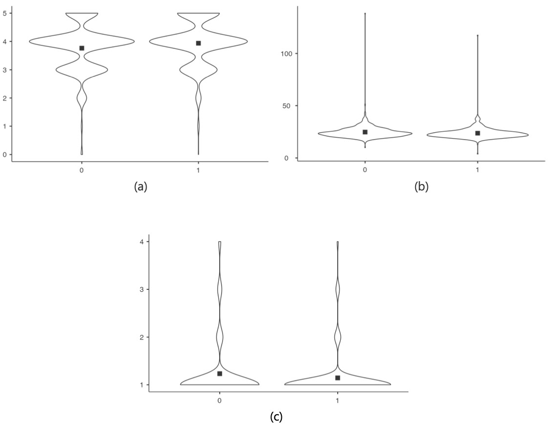 Fig. 2. Comparison of those health habits that differ between people with health education and those without. (a) Self-perceived health. (b) BMI in kg/m2. (c) Smoking. NOTE: 0: No Health Studies; 1: Health Studies.