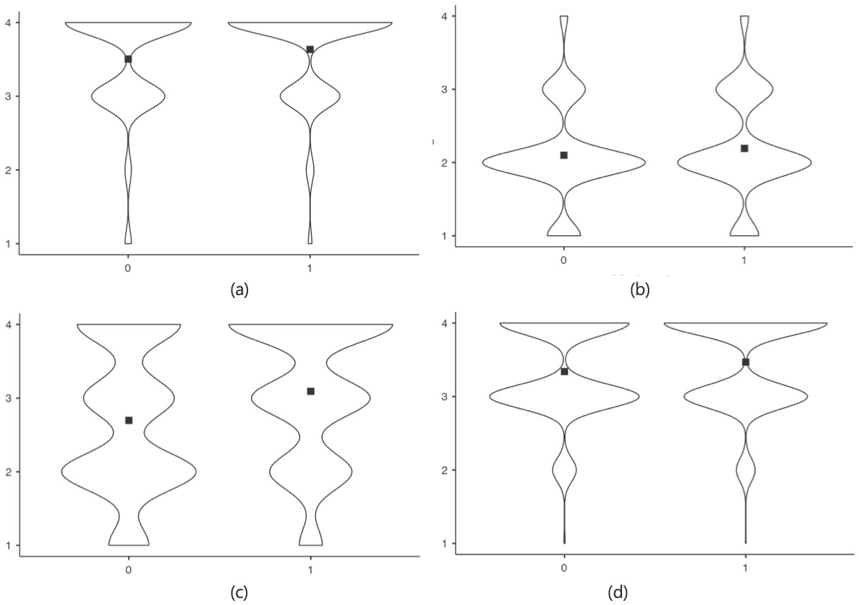 Fig. 3. Comparison of those nutritional habits that differ significantly between people with health education and those without using violin plots. (a) Vegetable. (b) Cereals. (c) Legumes. (d) Water. NOTE: 0: No Health Studies; 1: Health Studies.