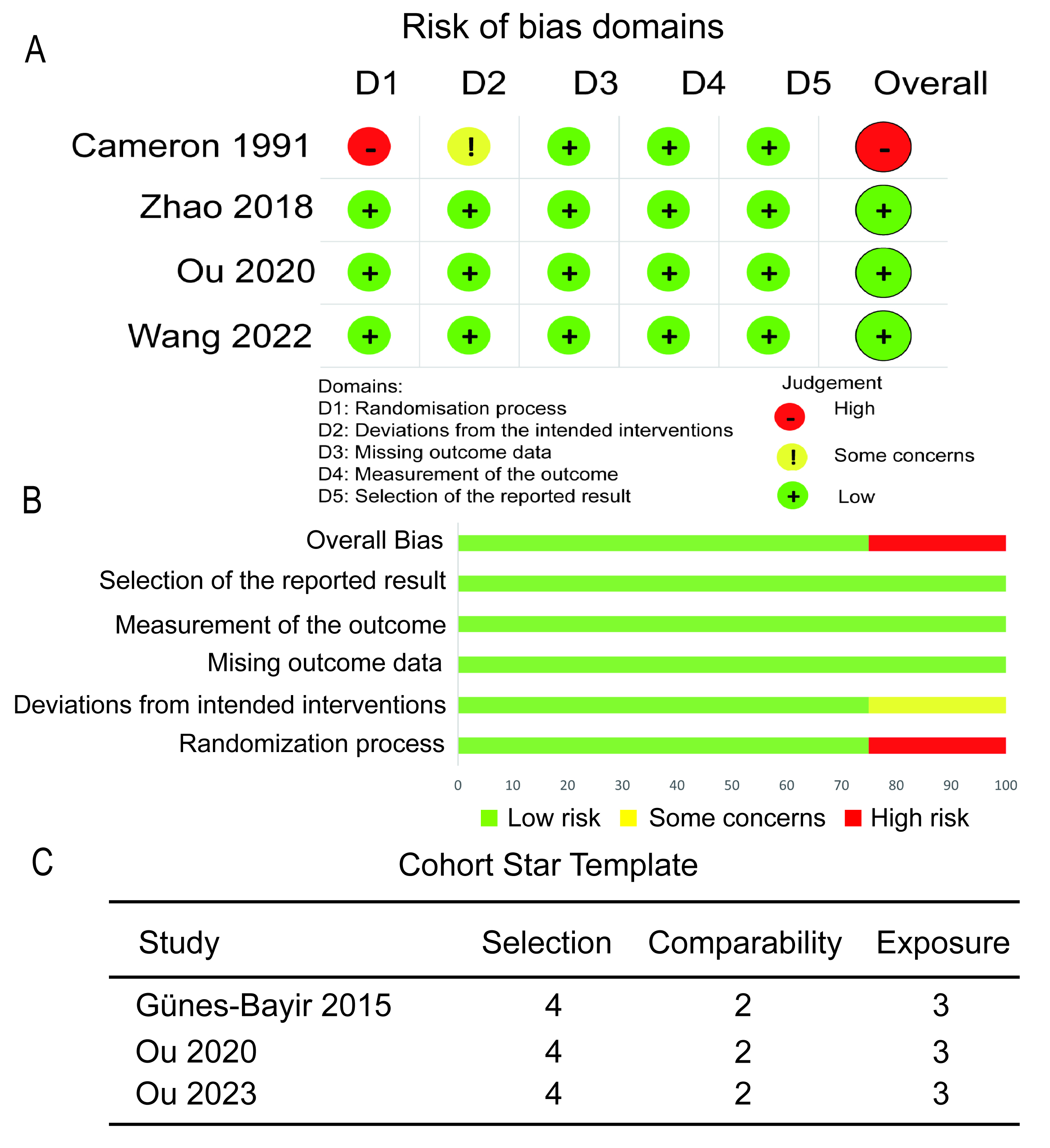 Fig. 2. Risk of bias assessment for primary outcome. (A) Traffic light plot of the RCTs. (B) Summary plot of the RCTs. (C) Assessment of the cohort studies.