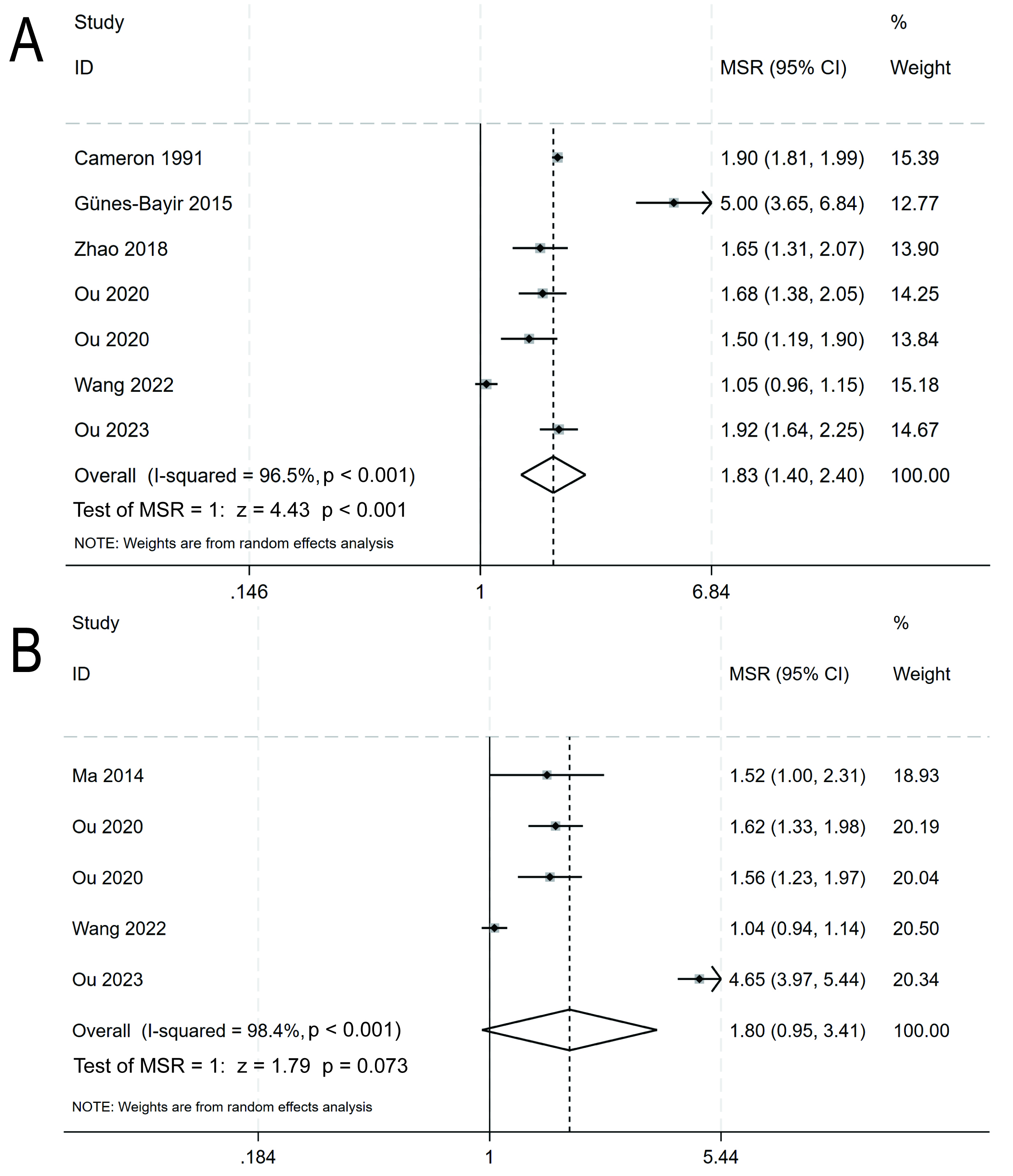 Fig. 3. The overall survival (A) and progression-free survival (B) of cancer patients who received intravenous vitamin C were compared to those who received no intravenous vitamin C. MSR, median survival ratio; CI, confidence interval.