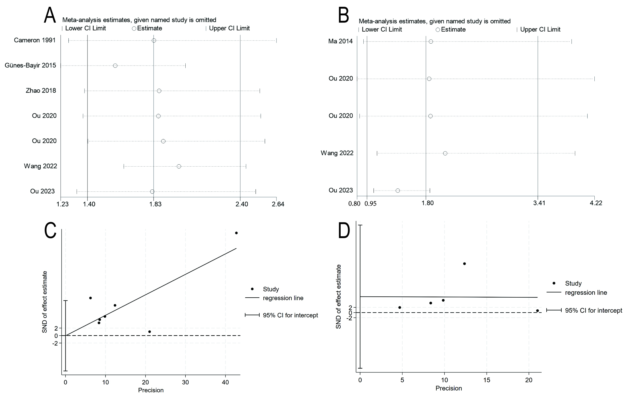 Fig. 4. Sensitivity analyses and funnel plots. (A) Sensitivity analysis for overall survival. (B) Sensitivity analysis for progression-free survival. (C) Egger test funnel plot for overall survival. (D) Egger test funnel plot for progression-free survival.