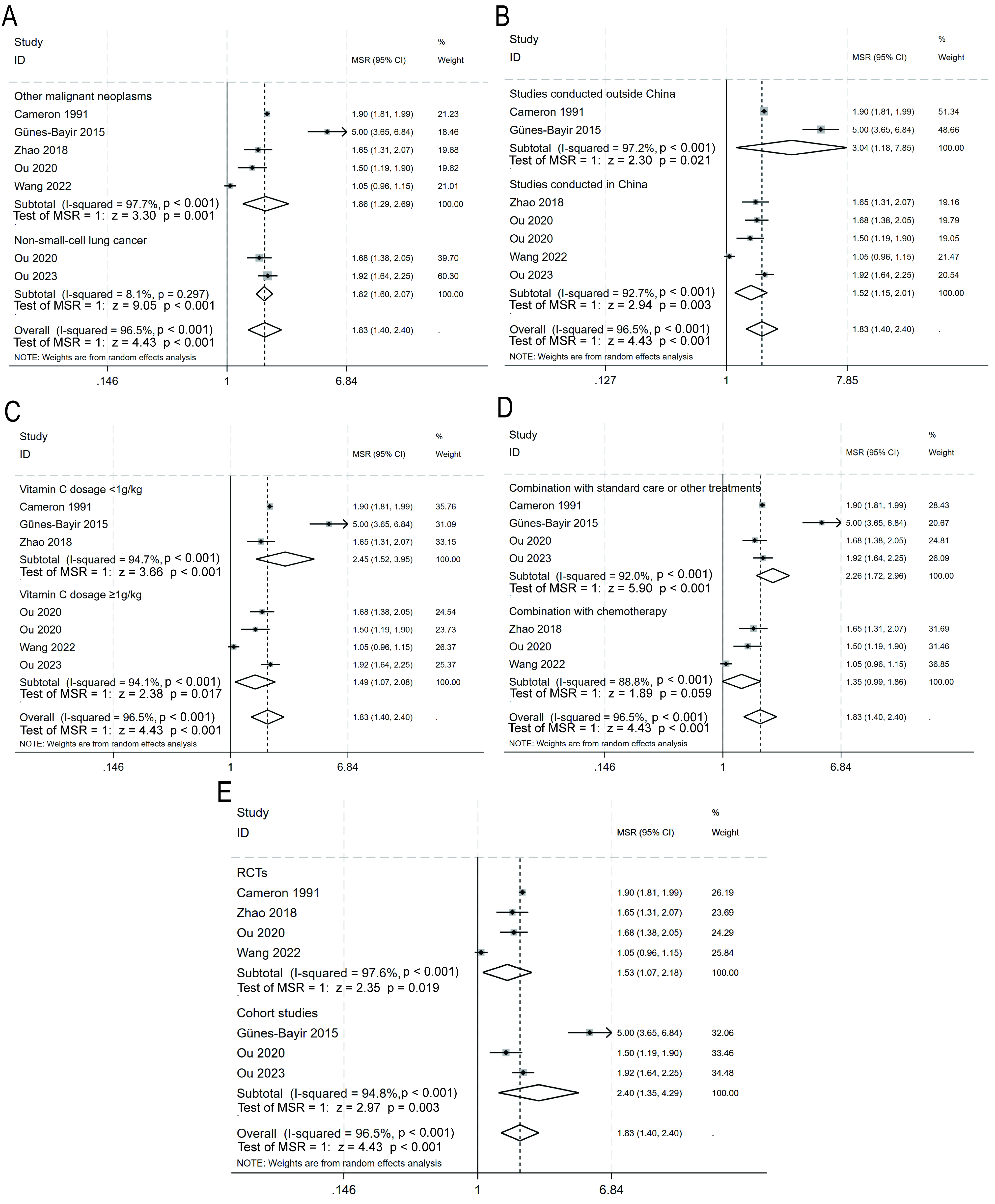 Five prespecified subgroups were analysed for the primary outcome: (1) non-small-cell lung cancer vs. other malignant neoplasms; (2) studies conducted in China vs. studies conducted outside China; (3) vitamin C dosage