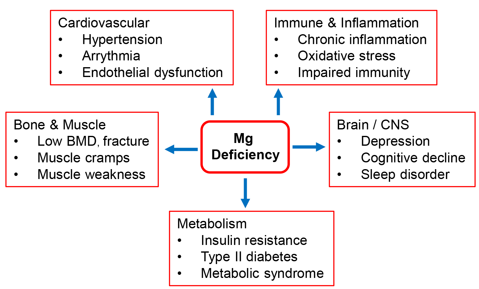 Major health consequences of magnesium deficiency. Magnesium serves as a cofactor for hundreds of enzymatic reactions critical to physiological function. Its deficiency is implicated in the development of type 2 diabetes, cardiovascular disease, hypertension, and osteoporosis. Although these disorders are multifactorial, magnesium deficiency–induced chronic low-grade inflammation and oxidative stress may further aggravate their underlying pathophysiology. BMD, bone mineral density; CNS, central nervous system.