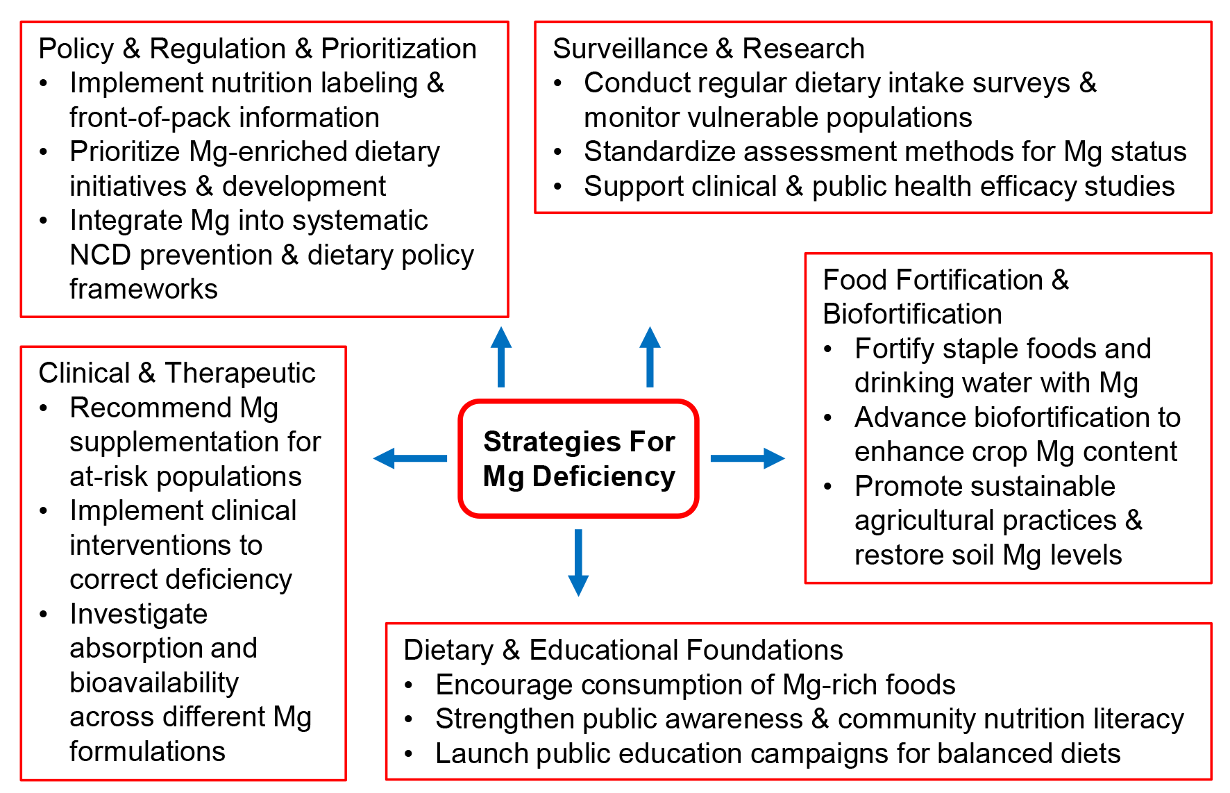 Addressing magnesium deficiency requires a multi-level strategy that integrates dietary improvement, clinical management, agricultural reform, and public health policy. Effective interventions must be tailored to both individual risk profiles and population-wide nutritional contexts to achieve sustainable improvements in magnesium status.