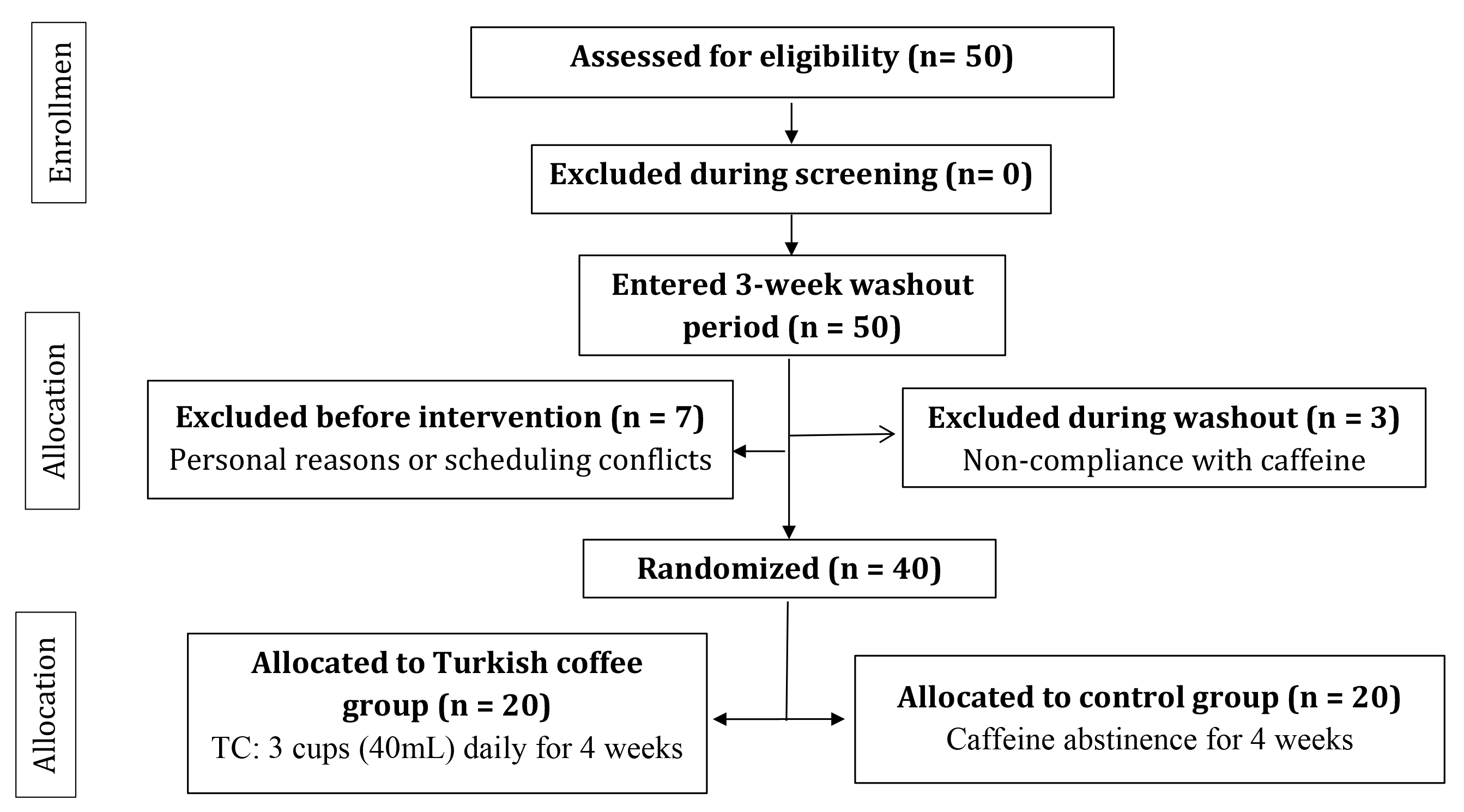 CONSORT flow diagram showing participant recruitment, screening, randomization, and allocation. The diagram illustrates the complete participant flow through the study from initial recruitment (n = 50) through final analysis (n = 40). Following initial screening, 47 participants completed a mandatory three-week caffeine washout period. Three participants were excluded during washout due to non-compliance with caffeine abstinence requirements. The remaining 47 eligible participants underwent stratified block randomization (stratified by BMI) into intervention (Turkish coffee consumption) or control (caffeine abstinence) groups. Seven participants withdrew voluntarily before intervention commencement due to personal reasons or scheduling conflicts. The final analyzed cohort comprised 40 participants: 20 in the intervention group (receiving three 40 mL cups of standardized Turkish coffee daily for four weeks) and 20 in the control group (maintaining caffeine abstinence for four weeks). All 40 participants who commenced the intervention completed the four-week protocol and were included in the final analysis with no dropouts or loss to follow-up. Abbreviations: TC, Turkish coffee; BMI, body mass index.