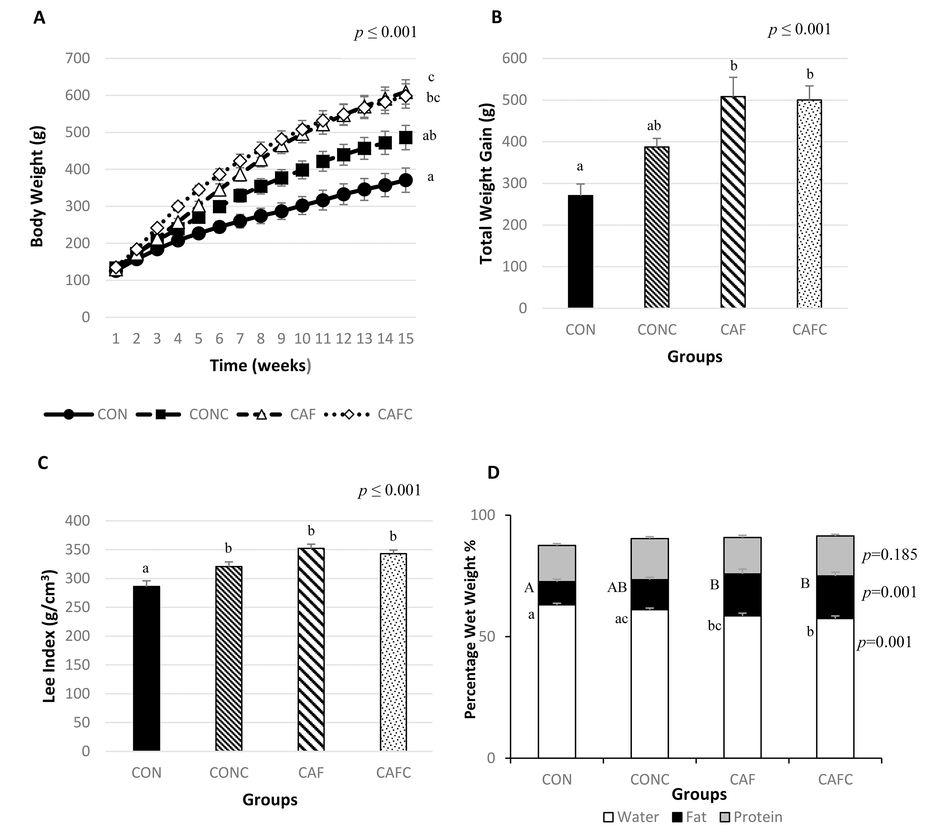 The plasma parameters measured at the end of the study are shown in Table 5. Dietary treatment had no impact on the levels of plasma cholesterol, triglycerides, glucose, insulin or C-peptide. Only plasma leptin levels showed a significant difference between groups (p = 0.017), with CAF having significantly higher levels compared to CON.