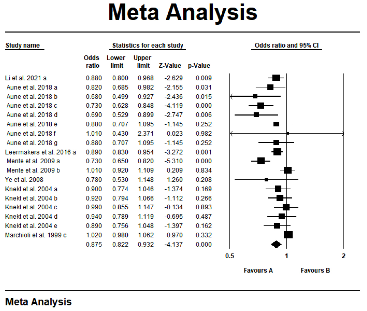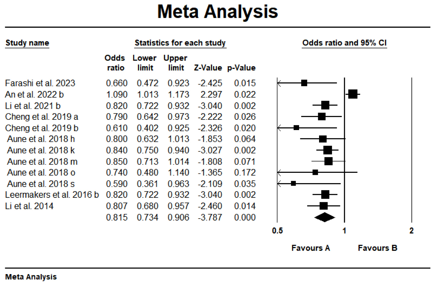 | Aune et al. 2018 m [35] | stroke | 3 | cohort | RR | 0.85 (0.71–1.01) | random | NR | NR | No | |