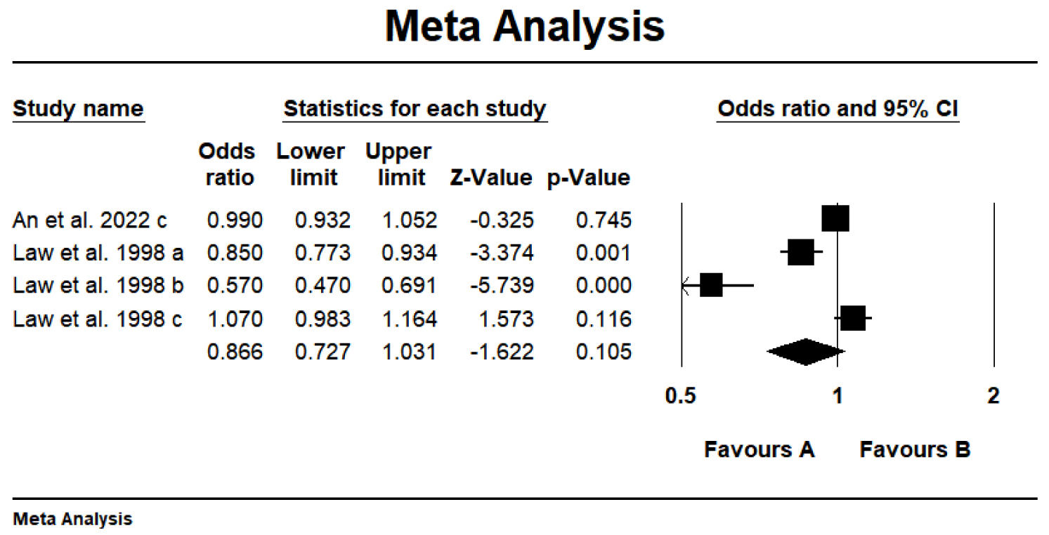 | Cheng et al. 2019 a [33] | stroke | 4 | CC, cohort | lycopene Intake | HR | 0.79 (0.64–0.97) | random | 0.44 | NR | Yes |