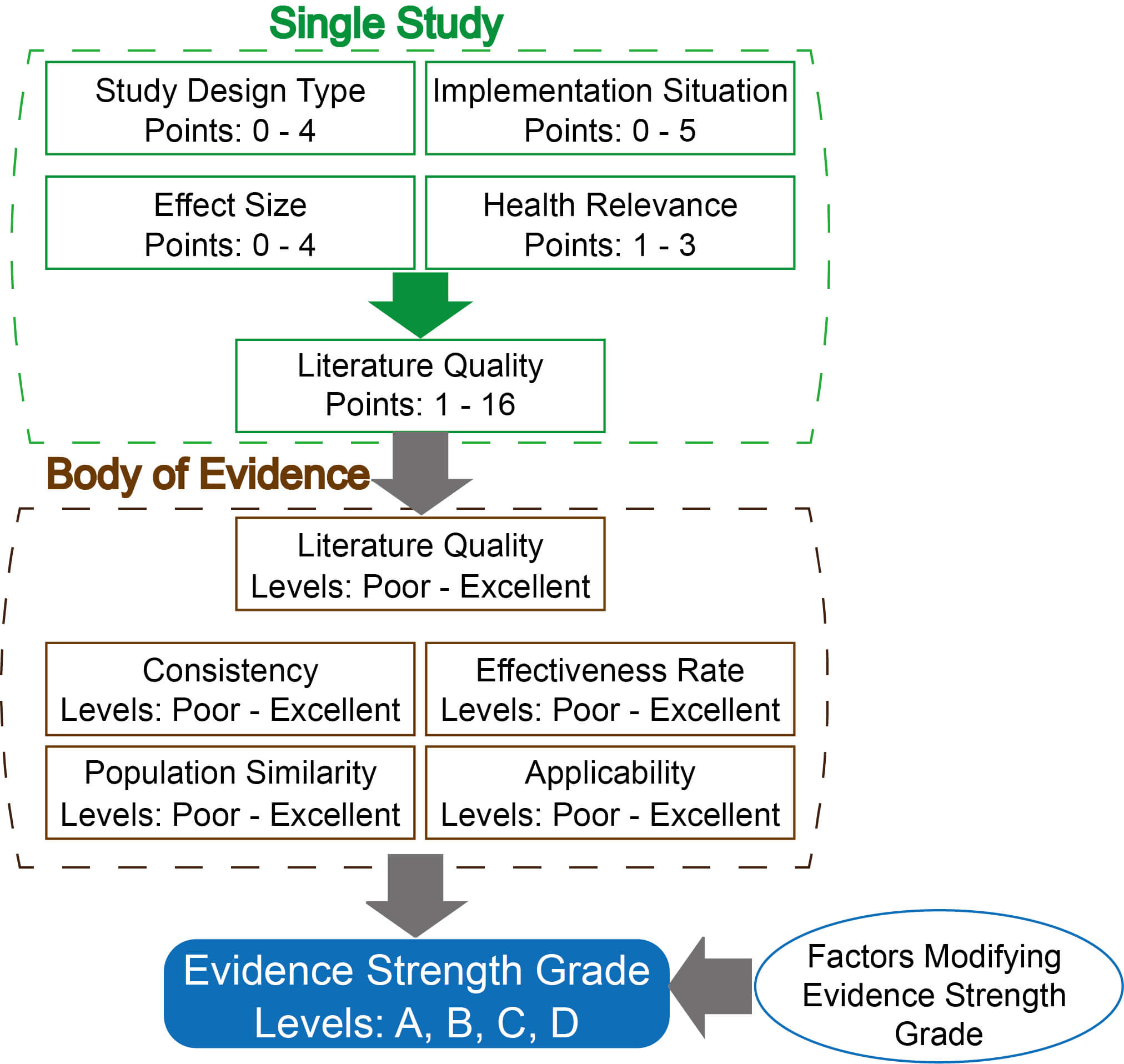 The preliminary grade of evidence strength is determined by evaluating five criteria (literature quality, consistency, effectiveness rate, population similarity, and applicability) according to the standards in Table 13.
