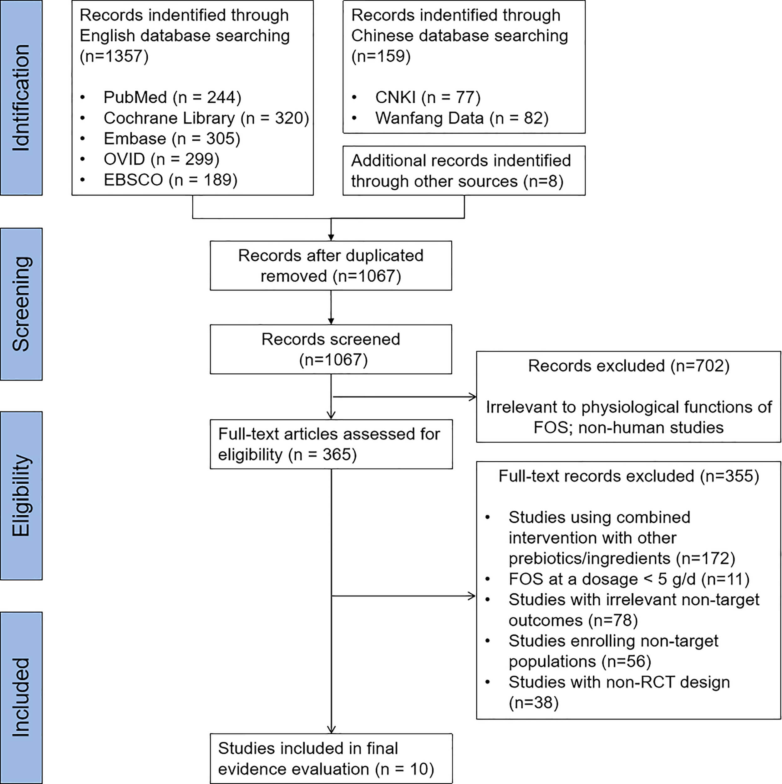 Systematic search terms for the literature retrieval were developed in both English and Chinese, with terms including fructooligosaccharides, oligofructose, oligosaccharides, constipation, bowel movement, intestinal transit time, defecation, stool consistency, stool frequency, and fecal wet weight. Predefined inclusion and exclusion criteria were established to align with the scientific question, with eligible studies required to (1) focus on the target adult population (aged 18–65 years including healthy adults with or without functional constipation), (2) measure the independent effect of FOS supplementation, (3) use an RCT study design, and (4) report at least one objective bowel function parameter, while studies were excluded if they were (1) conducted in populations with severe underlying disease such as malignant cancer, renal failure, or inflammatory bowel disease, (2) focused on special populations including young children, pregnant women, or adults aged over 70 years, (3) failed to isolate the independent effect of FOS such as multi-ingredient intervention studies without an isolated FOS arm, or (4) consisted of in vitro studies, animal studies, review articles, case reports, or non-peer-reviewed grey literature.