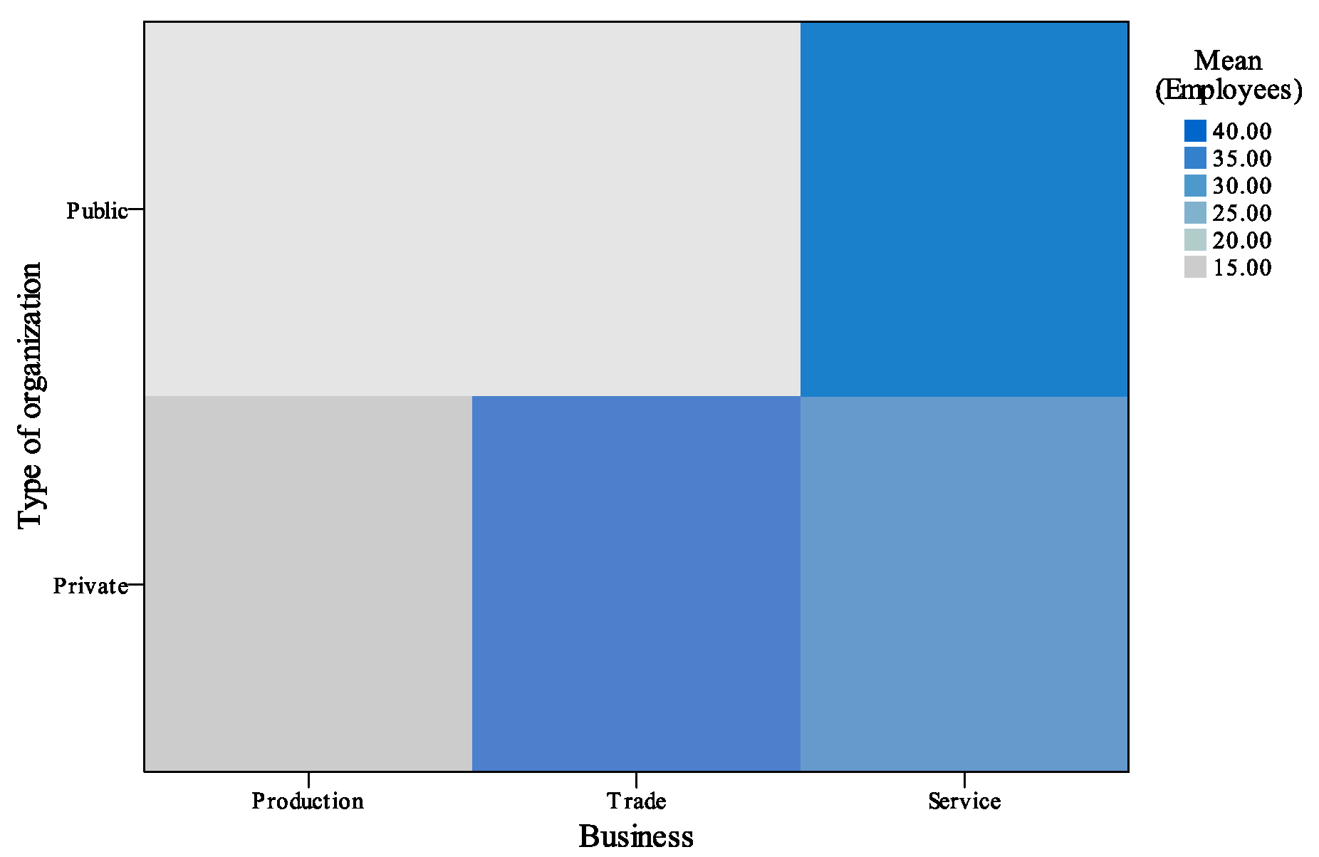 In addition to the t-test and the ANOVA analysis of the demographic and control variables, heat maps of the business ownership type vs. activity and the gender vs. role in business were generated in the SPSS environment. The manufacturing and trade enterprises were all privately owned, while the service enterprises were publicly owned (Fig. 3) in the data set analyzed.