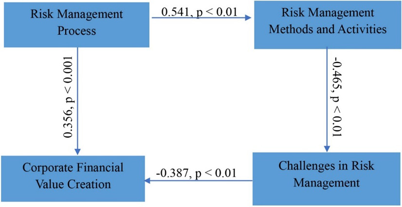 Thirdly, we observe that the challenges in risk management have a negative impact on corporate financial value creation, as indicated by a path coefficient of –0.387 (p