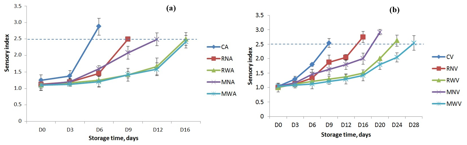 Fig. 1a,b show the sensory index quality of raw chicken legs stored at 4