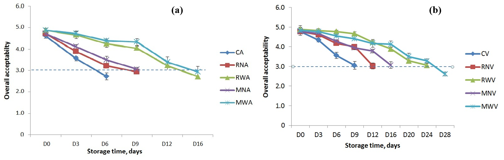 Table 4 shows pH changes in chilled chicken legs under AP and VP conditions. The initial pH values for all chicken sample groups ranged from 6.96 to 7.03.