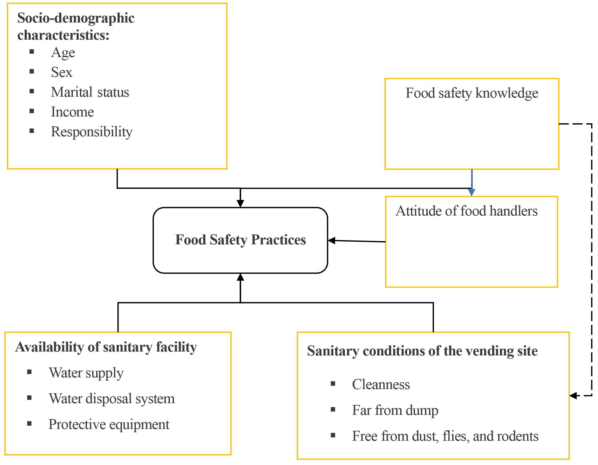 In this study, the dependent variable was food safety practices. The independent variables encompassed sociodemographic factors, including age, gender, marital status, income, and responsibility. Additionally, the study examined the handlers’ knowledge of food safety practices and the Attitude of food handlers on food safety practices. Availability of sanitary facilities like water supply, disposal system, and protective equipment. Sanitary conditions of the vending site, like cleanness, distance from dump sites, and free from dust, flies, and rodents.