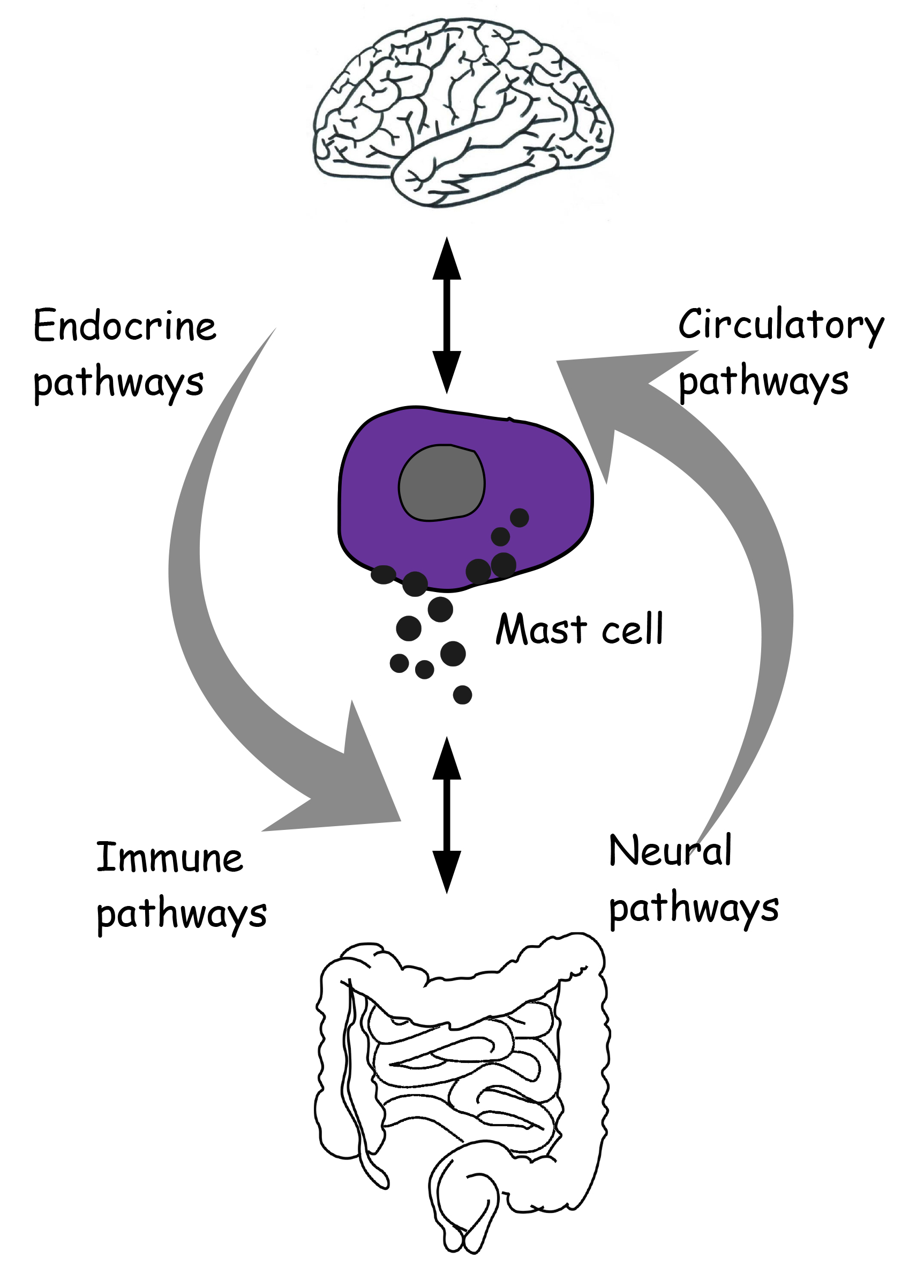 Fig. 1.Reciprocal neuro-immune-circulatory communication between brain and gut. Mast cells are proposed as an integral and unifying part of the microbiota-gut-brain axis.