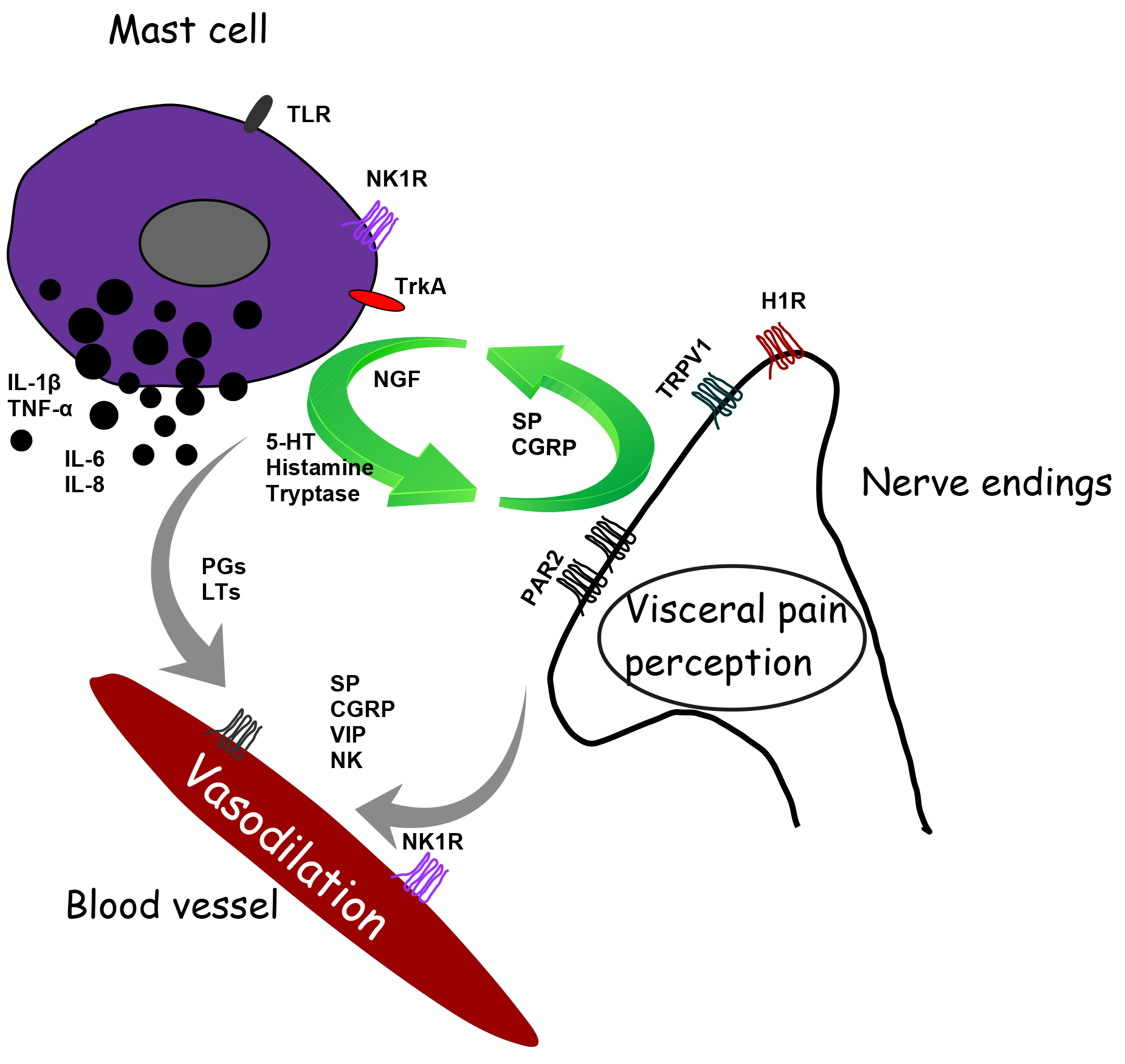 Fig. 2.Schematic representation of the interaction between mast cell and ending nerve fibers and blood vessels in the gastrointestinal tract’s mucous tissue to modulate motility and pain signaling. H1R, histamine-1 receptor; TRPV1, transient receptor vanilloid 1; 5-HT, serotonin; 5-HT3, 5-hydroxytryptamine receptor; PAR2, proteinase-activated receptor-2; TrkA, receptor for nerve growth factor; TLR, toll-like receptor; NK1, neurokinin 1 receptor; SP, substance P; CGRP, calcitonin-related gene peptide; NGF, neuronal growth factor; PGs, prostaglandins; LTs, leukotrienes; VIP, vasoactive intestinal polypeptide.