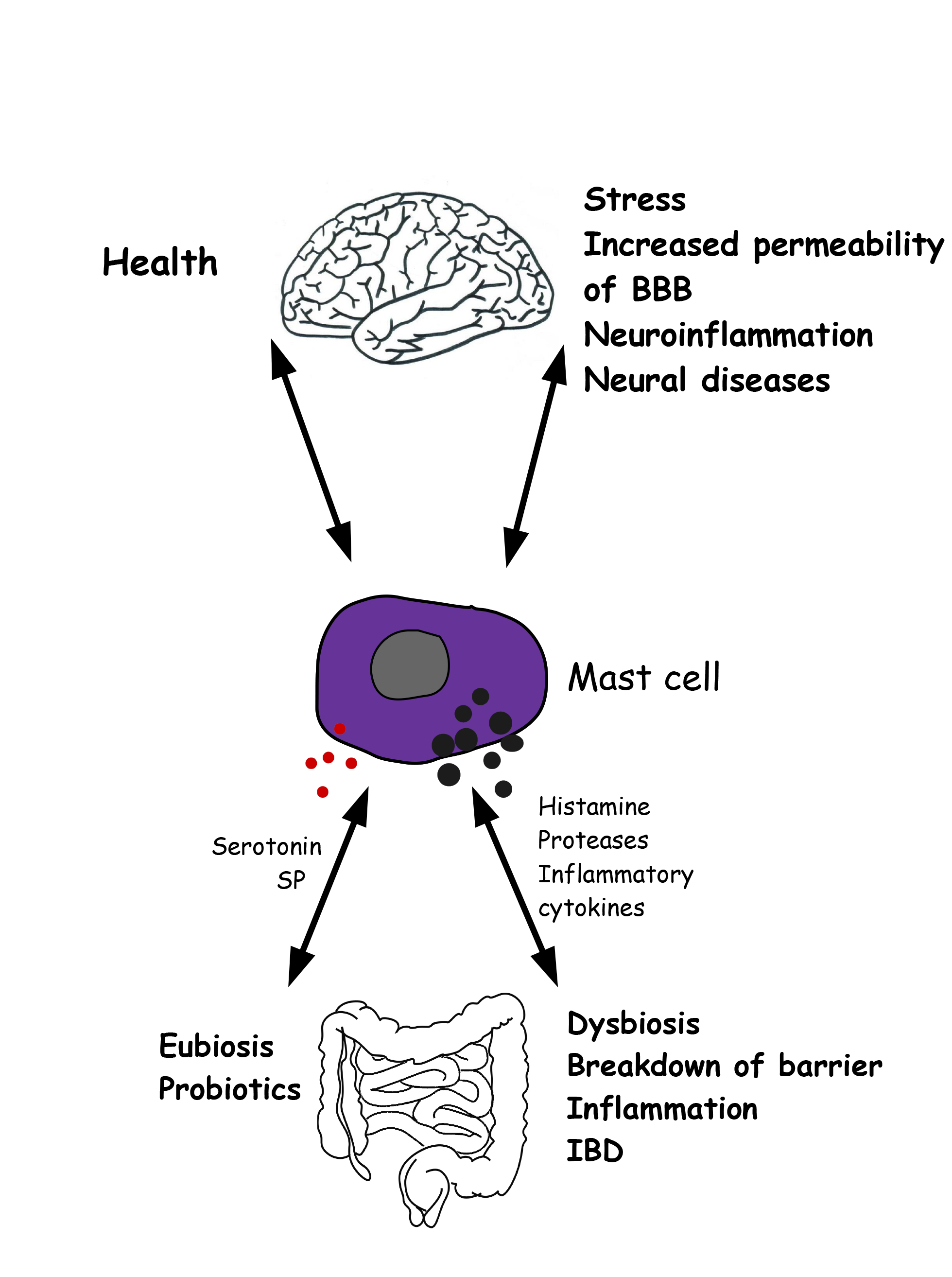 The microbial composition may play a role in several conditions involving the brain, and the microbiota-gut-brain axis may affect emotions, motivation and other complex cognitive functions. The microbiota can serve its host to neutralize drugs and carcinogens, modulating motility and affecting visceral perception. MCs exacerbate neuroinflammation, functioning as proinflammatory cells. Stabilizing the MCs provides interesting tools to control the permeability of the intestinal epithelial barrier. Therefore, MCs are excellent indicators and health tools and can provide suggestions for therapeutical interventions.