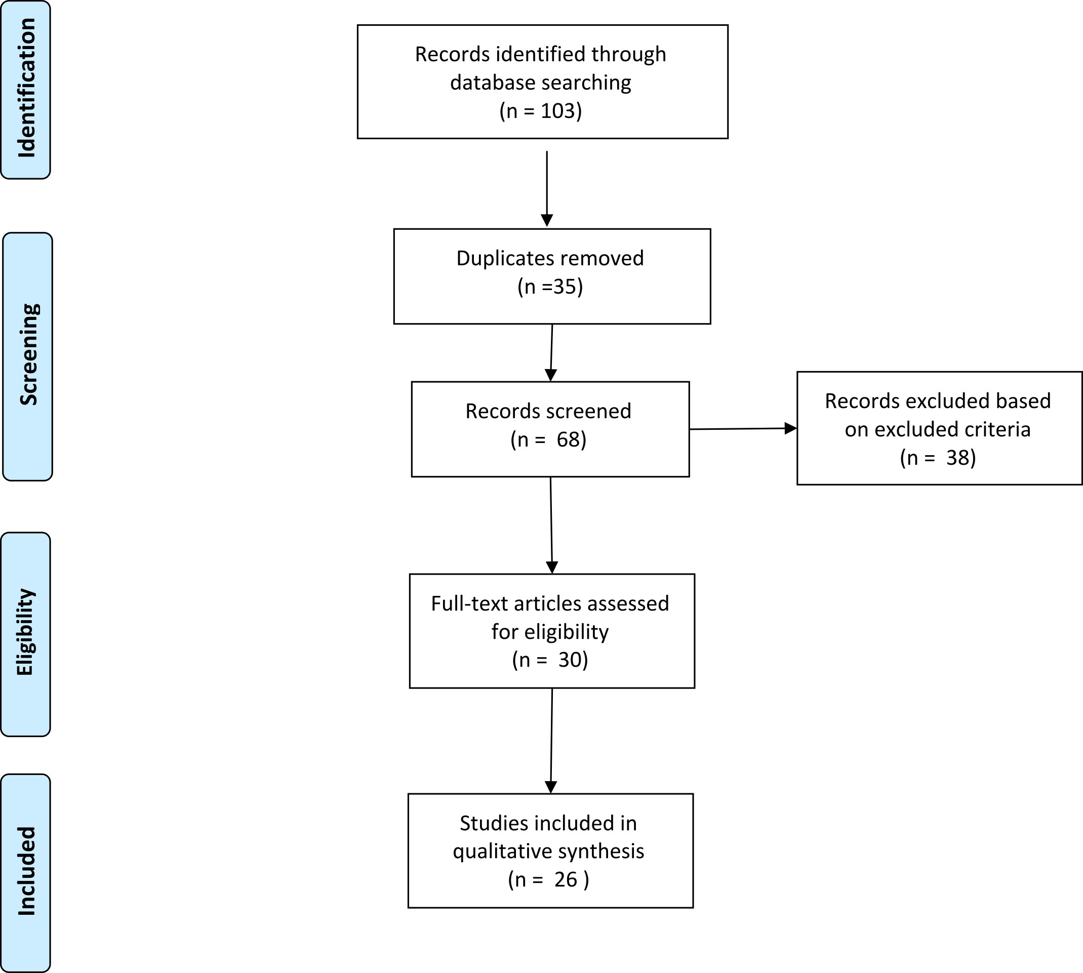 We identified articles through careful search in PubMed, Web of Science, and Cochrane databases. The search combined the following terms: “hypersexuality”; “nervous system”; “diseases”; “sexual behaviors”; “neurological disease”. All results of each database between 2010 and 2020 were evaluated (Fig. 1). First, we eliminated duplicates and evaluated the remaining articles based on title and abstract. The inclusion criteria were: (i) HS; (ii) neurological pathologies; (iii) publication in peer-reviewed journals; and (iv) English language. In addition, we have excluded: (i) conference proceedings, (ii) reviews, (iii) studies on animal samples and (iv) studies involving patients with “pure” psychiatric disorders. Overall, we identified 103 articles, from which we excluded 35 duplicates (Fig. 1). Subsequently, we identified 26 manuscripts that met the inclusion/exclusion criteria by evaluating the year and type of publication, participants, and purposes of the studies (Table 1, Ref. [6, 8, 14, 15, 16, 17, 18, 19, 20, 21, 22, 23, 24, 25, 26, 27, 28, 29, 30, 31, 32, 33, 34]).
