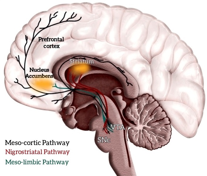 Fig. 2.The main neurological pathways and areas involved in hypersexuality. The mesolimbic pathway is responsible for reward learning during the mesocortical for executive decision making. The mesocorticolimbic dopaminergic network connects to key cortical and subcortical regions, most notably the prefrontal cortex (PFC), ventral striatum, ventral tegmental area (VTA), and amygdala. The nucleus accumbens (NAc) plays a crucial role in reinforcing learning. Dysregulation of these circuits leads to the clinical manifestation of impulsive and compulsive behaviors, including HS.