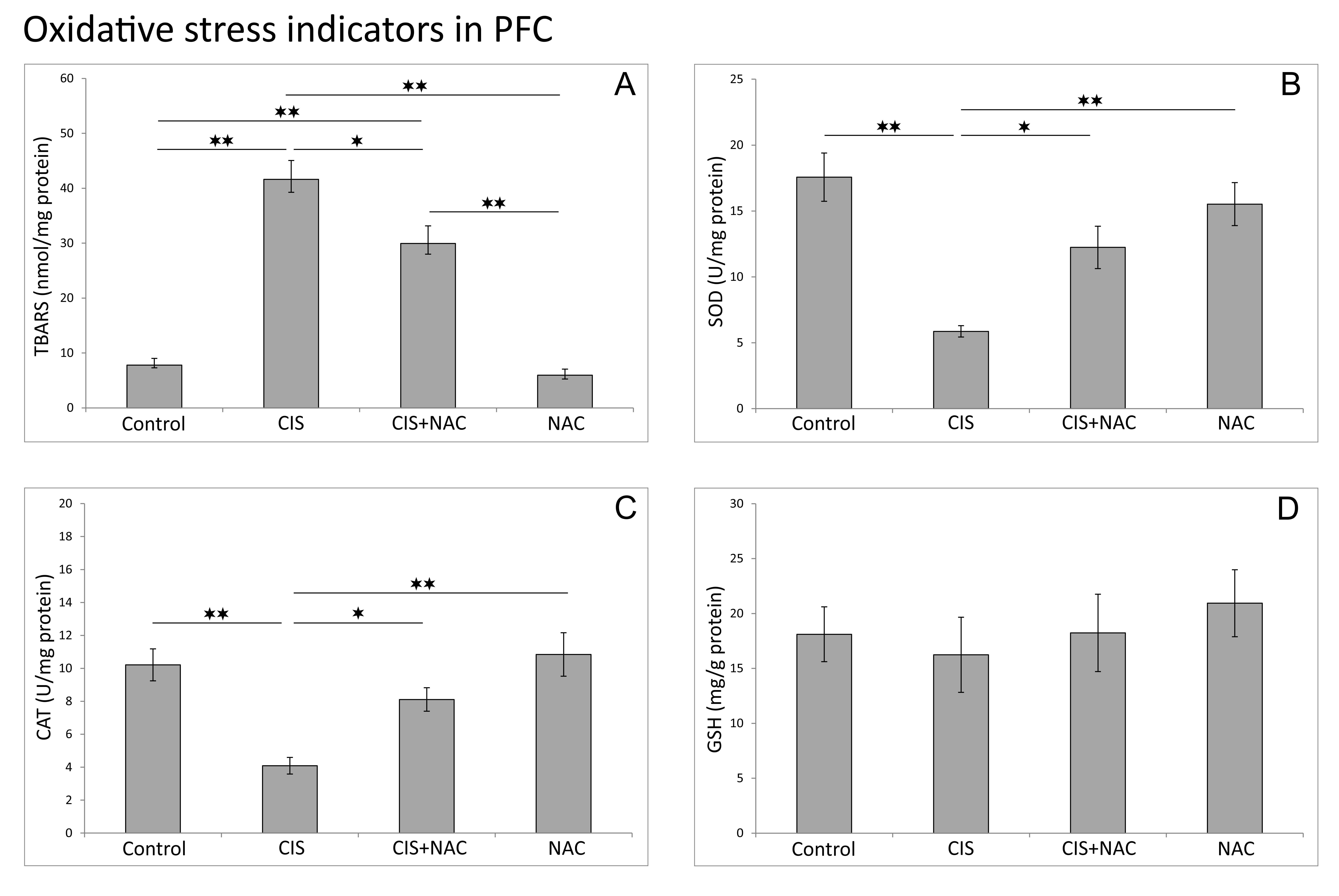 In summary, the results obtained in this study lead to the conclusion that antioxidant supplementation with NAC diminished cisplatin-induced oxidative damage and apoptosis in PFC, which is in turn manifested by specific behavioral alterations.