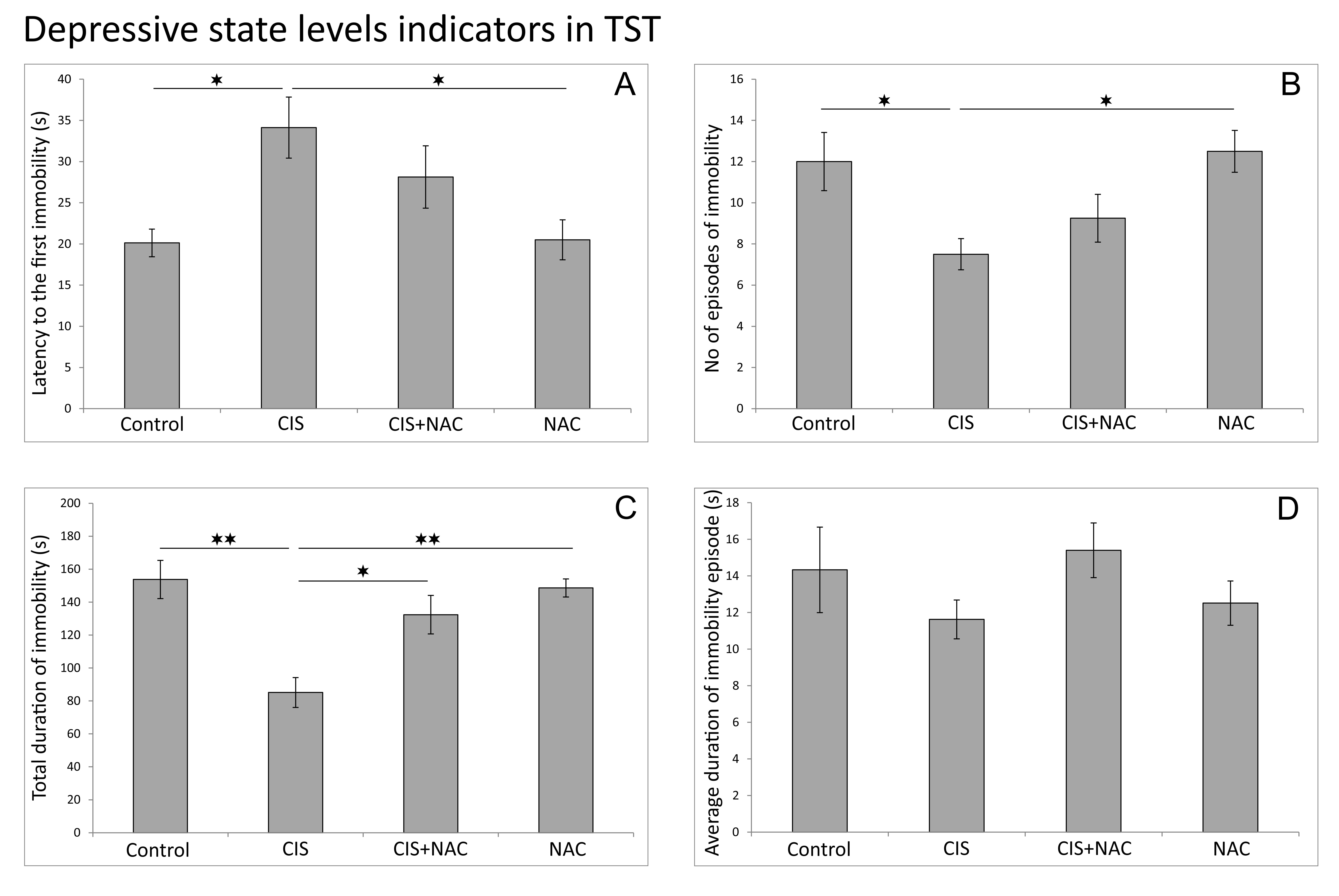 The aim of this study was to allow additional information considering the behavioral manifestations of cisplatin-induced neurotoxicity. Following one of the confirmed patophysiological mechanism underlying this adverse effect of cisplatin, we also intended to evaluate the potential role of antioxidant supplementation with NAC in the prevention of alterations in depressive-like behavior in rats.