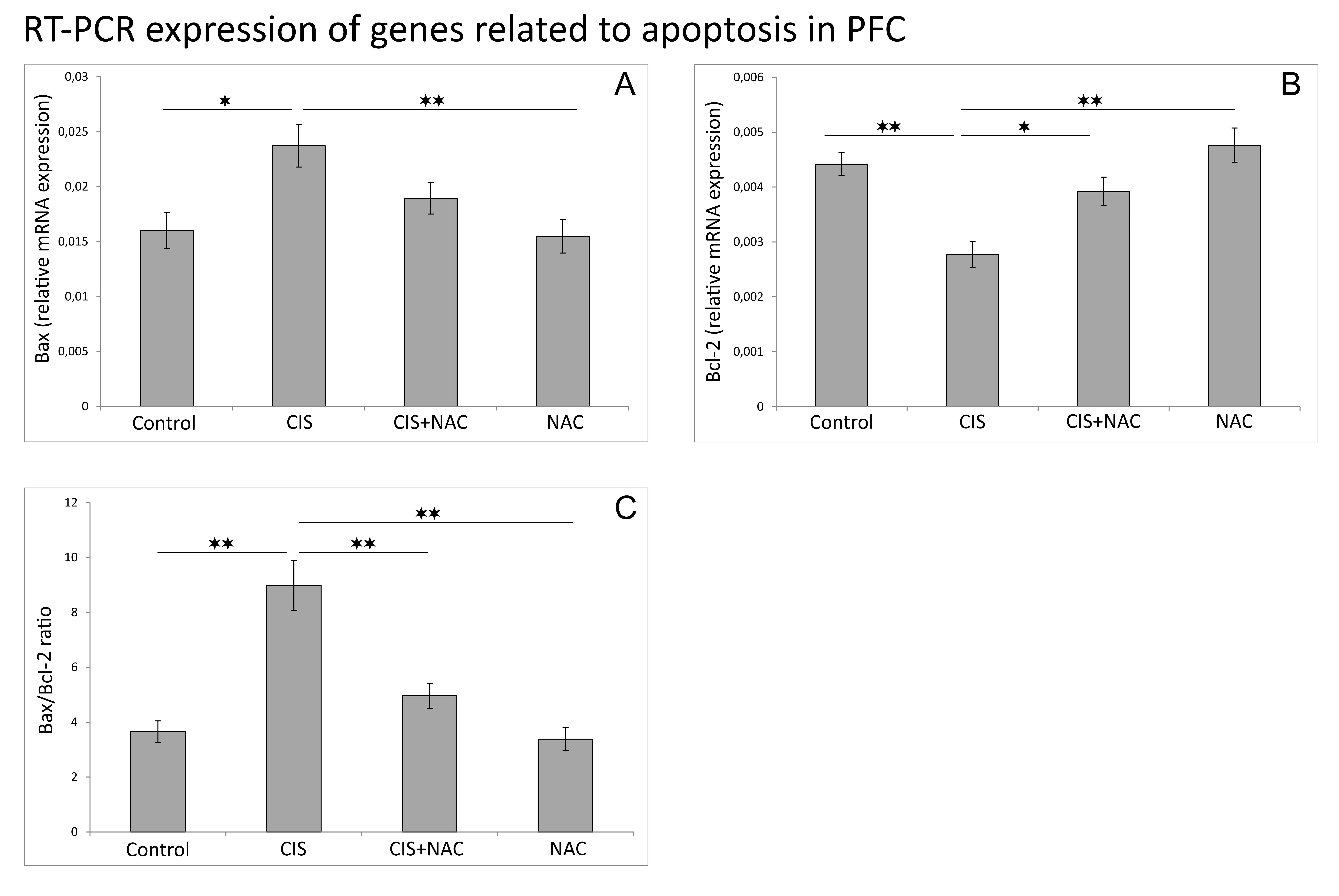 In summary, the results obtained in this study lead to the conclusion that antioxidant supplementation with NAC diminished cisplatin-induced oxidative damage and apoptosis in PFC, which is in turn manifested by specific behavioral alterations.