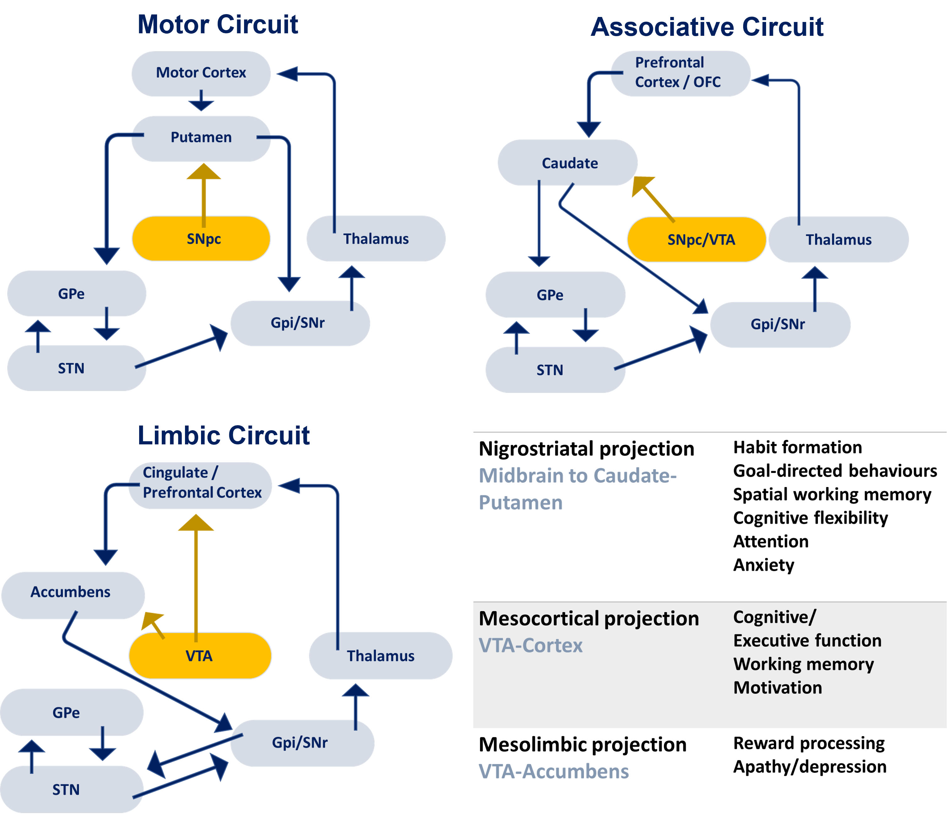 Three parallel cortico-striatal-pallido-thalamo-cortical loops exist, which are modulated by DA input from both the SNc and the VTA (Fig. 1). The mesostriatal DAergic circuit, which comprises the ventral midbrain, posterolateral putamen, dorsolateral subthalamic nucleus, and primary motor cortex, controls motor function, but recent studies also reveal roles in cognitive functions. The mesocortical DAergic circuit, which comprises the head of the caudate nucleus, rostral putamen, intermediate zone of subthalamic nucleus, and the dorsolateral prefrontal cortex, is involved in executive functions. The mesolimbic DAergic circuit, which comprises the nucleus accumbens, ventromedial striatum, rostral ventral, ventromedial subthalamic nucleus and anterior cingulate cortex, is involved in reward processing and apathy/depression.