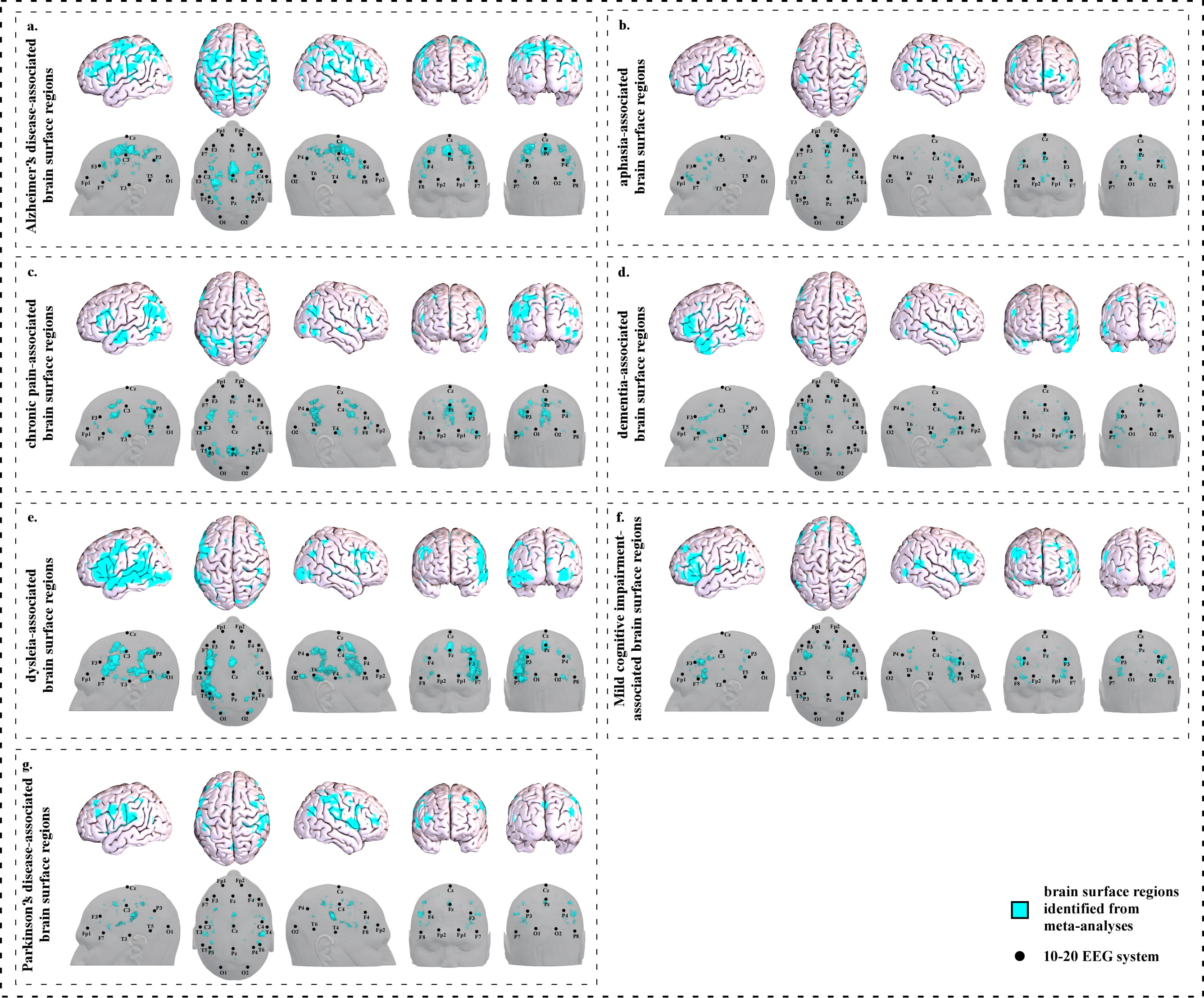 Brain surface regions for scalp stimulation for neurological disorders, identified from meta-analyses of neuroimaging studies. (a) Alzheimer’s disease-associated surface regions. (b) Aphasia-associated surface regions. (c) Chronic pain-associated surface regions. (d) Dementia-associated surface regions. (e) Dyslexia-associated surface regions. (f) Mild cognitive impairment-associated surface regions. (g) Parkinson’s disease-associated surface regions.