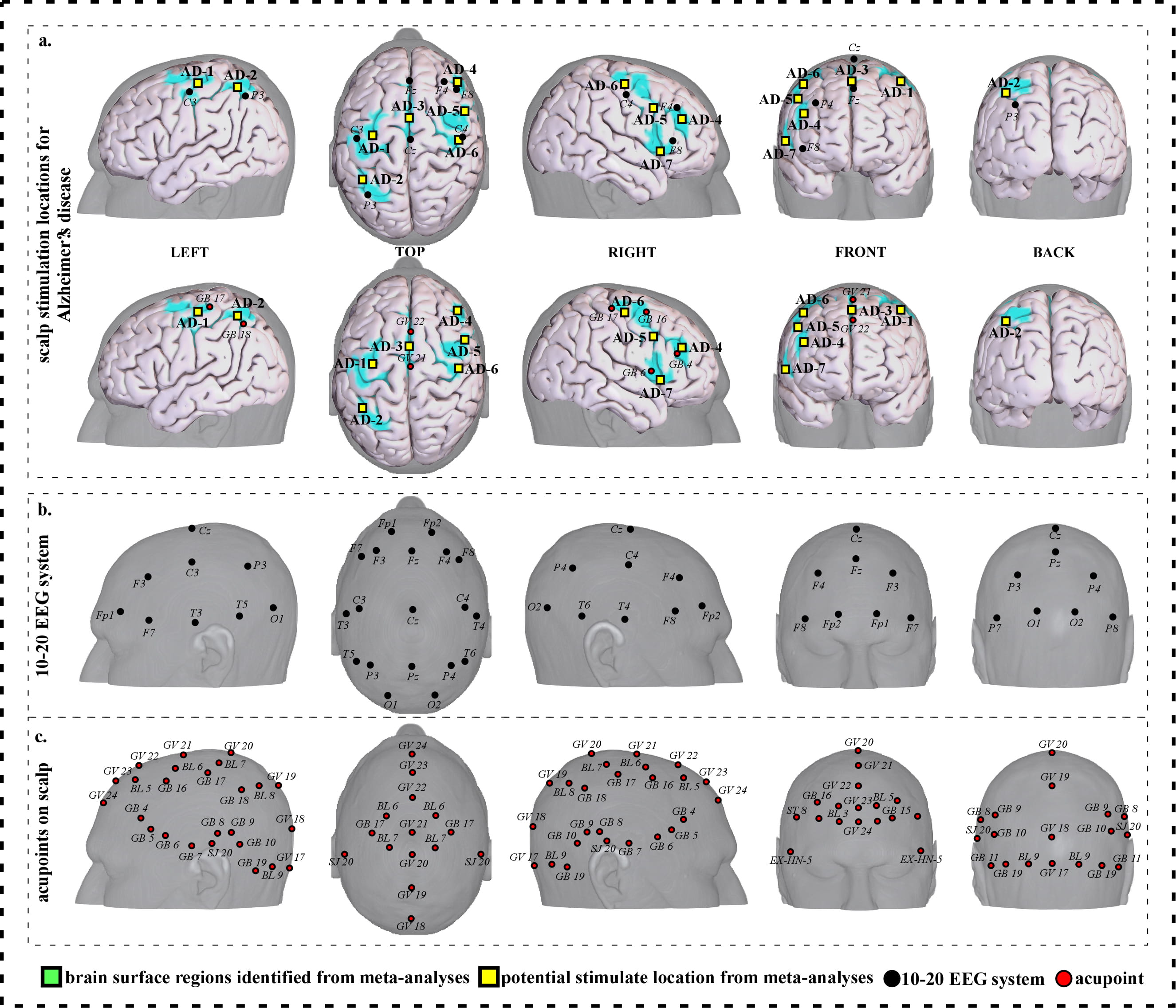 Neuroimaging-based scalp stimulation protocols for Alzheimer’s disease. (a) Scalp stimulation locations for Alzheimer’s disease. Upper and lower panels of a to g. applied the 10–20 EEG system, and international acupoints, respectively, to facilitate identifying the locations. (b) 10–20 EEG system locations. (c) Acupoint locations. Abbreviations: AD, Alzheimer’s disease; GV 17, Naohu; GV 18, Qiangjian; GV 19, Houding; GV 20, Baihui; GV 21, Qianding; GV 22, Xinhui; GV 23, Shangxing; GV 24, Shenting; GB 4, Hanyan; GB 5, Xuanlu; GB 6, Xuanli; GB 7, Qubin; GB 8, Shuaigu; GB 9, Tianchong; GB 10, Fubai; GB 11, Touqiaoyin; GB 15, Toulinqi; GB 16, Muchuang; GB 17, Zhengying; GB 18, Chengling; GB 19, Naokong; BL 5, Wuchu; BL 6, Chengguang; BL 7, Tongtian; BL 8, Luoque; BL 9, Yuzhen; SJ 20, Jiaosun; ST 8, Touwei; EX-HN-5, Taiyang.