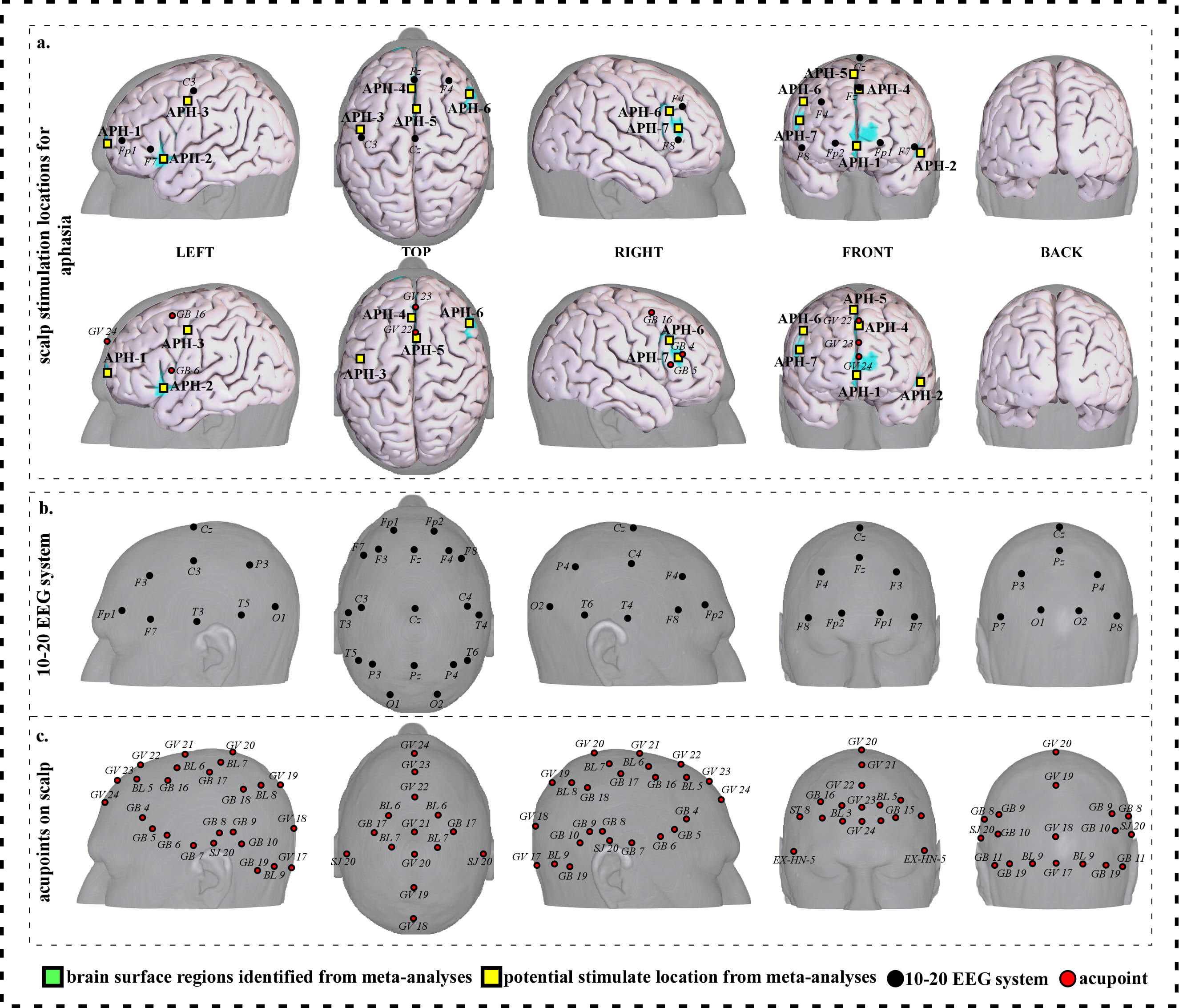 Neuroimaging-based scalp stimulation protocols for aphasia. (a) Scalp stimulation locations for aphasia. Upper and lower panels of a to g. applied the 10–20 EEG system, and international acupoints, respectively, to facilitate identifying the locations. (b) 10–20 EEG system locations. (c) Acupoint locations. Abbreviations: AD, Alzheimer’s disease; GV 17, Naohu; GV 18, Qiangjian; GV 19, Houding; GV 20, Baihui; GV 21, Qianding; GV 22, Xinhui; GV 23, Shangxing; GV 24, Shenting; GB 4, Hanyan; GB 5, Xuanlu; GB 6, Xuanli; GB 7, Qubin; GB 8, Shuaigu; GB 9, Tianchong; GB 10, Fubai; GB 11, Touqiaoyin; GB 15, Toulinqi; GB 16, Muchuang; GB 17, Zhengying; GB 18, Chengling; GB 19, Naokong; BL 5, Wuchu; BL 6, Chengguang; BL 7, Tongtian; BL 8, Luoque; BL 9, Yuzhen; SJ 20, Jiaosun; ST 8, Touwei; EX-HN-5, Taiyang.