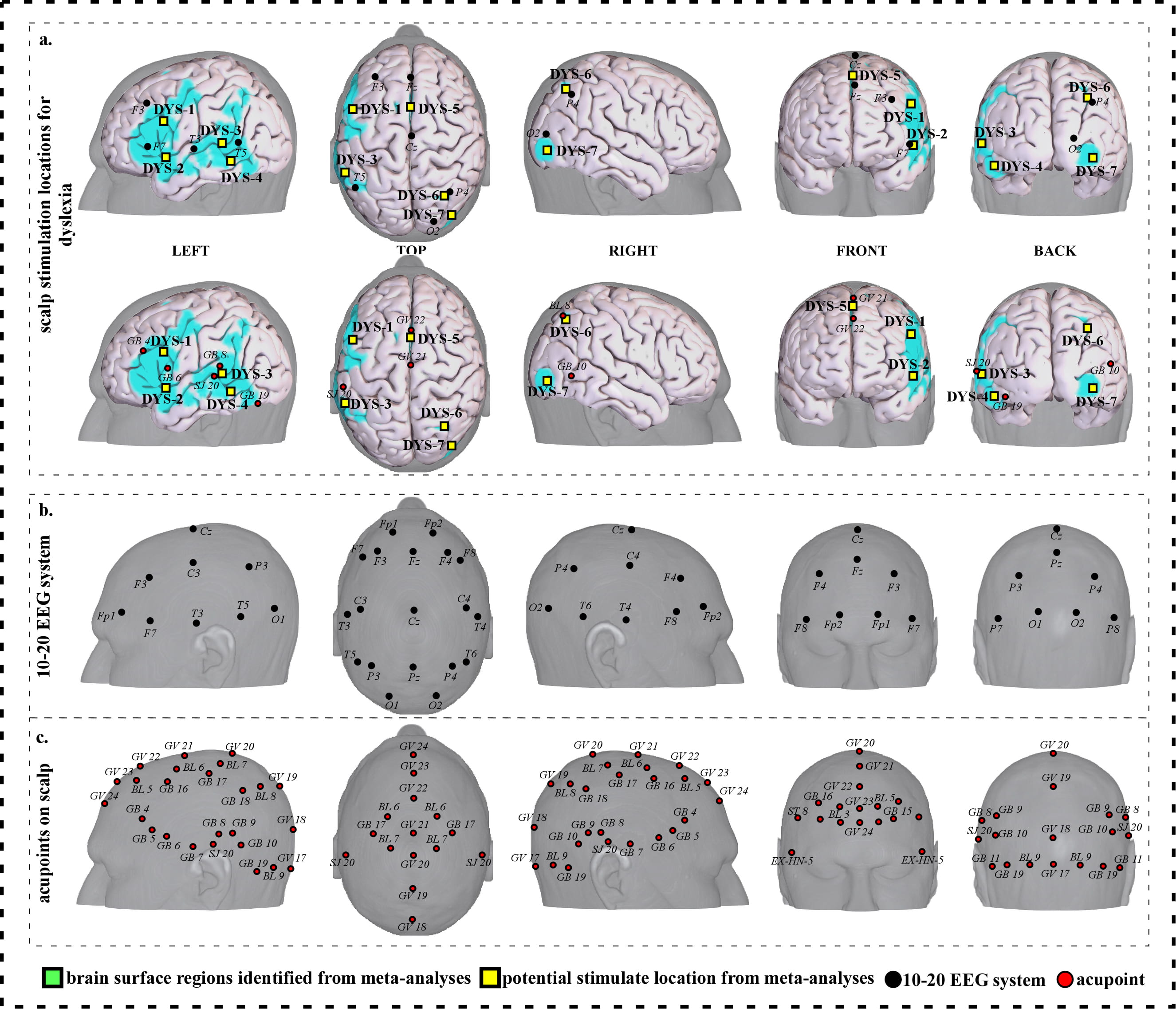 Neuroimaging-based scalp stimulation protocols for dyslexia. (a) Scalp stimulation locations for dyslexia. Upper and lower panels of a to g. applied the 10–20 EEG system, and international acupoints, respectively, to facilitate identifying the locations. (b) 10–20 EEG system locations. (c) Acupoint locations. Abbreviations: AD, Alzheimer’s disease; GV 17, Naohu; GV 18, Qiangjian; GV 19, Houding; GV 20, Baihui; GV 21, Qianding; GV 22, Xinhui; GV 23, Shangxing; GV 24, Shenting; GB 4, Hanyan; GB 5, Xuanlu; GB 6, Xuanli; GB 7, Qubin; GB 8, Shuaigu; GB 9, Tianchong; GB 10, Fubai; GB 11, Touqiaoyin; GB 15, Toulinqi; GB 16, Muchuang; GB 17, Zhengying; GB 18, Chengling; GB 19, Naokong; BL 5, Wuchu; BL 6, Chengguang; BL 7, Tongtian; BL 8, Luoque; BL 9, Yuzhen; SJ 20, Jiaosun; ST 8, Touwei; EX-HN-5, Taiyang.