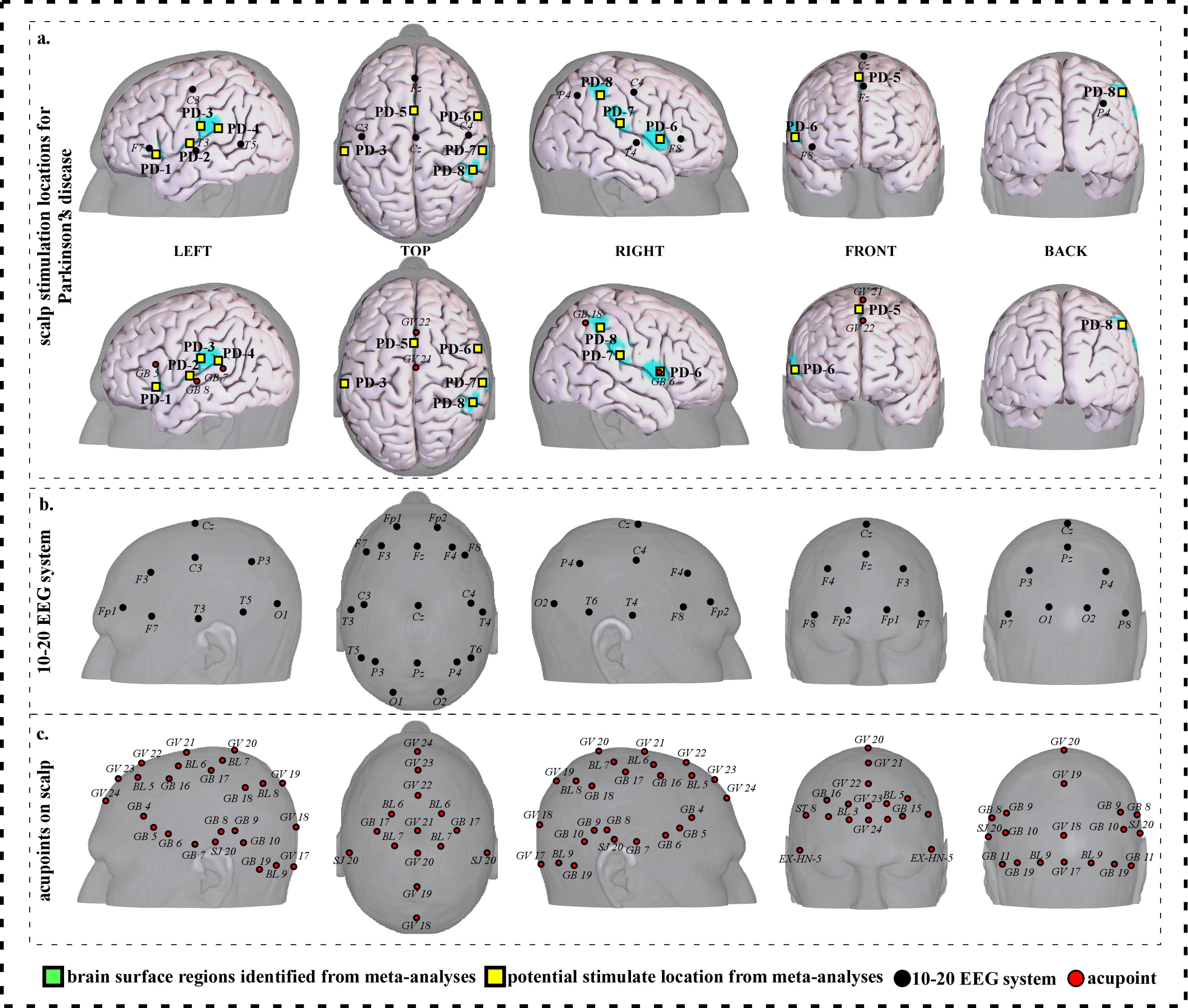 Neuroimaging-based scalp stimulation protocols for Parkinson’s disease. (a) Scalp stimulation locations for Parkinson’s disease. Upper and lower panels of a to g. applied the 10–20 EEG system, and international acupoints, respectively, to facilitate identifying the locations. (b) 10–20 EEG system locations. (c) Acupoint locations. Abbreviations: AD, Alzheimer’s disease; GV 17, Naohu; GV 18, Qiangjian; GV 19, Houding; GV 20, Baihui; GV 21, Qianding; GV 22, Xinhui; GV 23, Shangxing; GV 24, Shenting; GB 4, Hanyan; GB 5, Xuanlu; GB 6, Xuanli; GB 7, Qubin; GB 8, Shuaigu; GB 9, Tianchong; GB 10, Fubai; GB 11, Touqiaoyin; GB 15, Toulinqi; GB 16, Muchuang; GB 17, Zhengying; GB 18, Chengling; GB 19, Naokong; BL 5, Wuchu; BL 6, Chengguang; BL 7, Tongtian; BL 8, Luoque; BL 9, Yuzhen; SJ 20, Jiaosun; ST 8, Touwei; EX-HN-5, Taiyang.