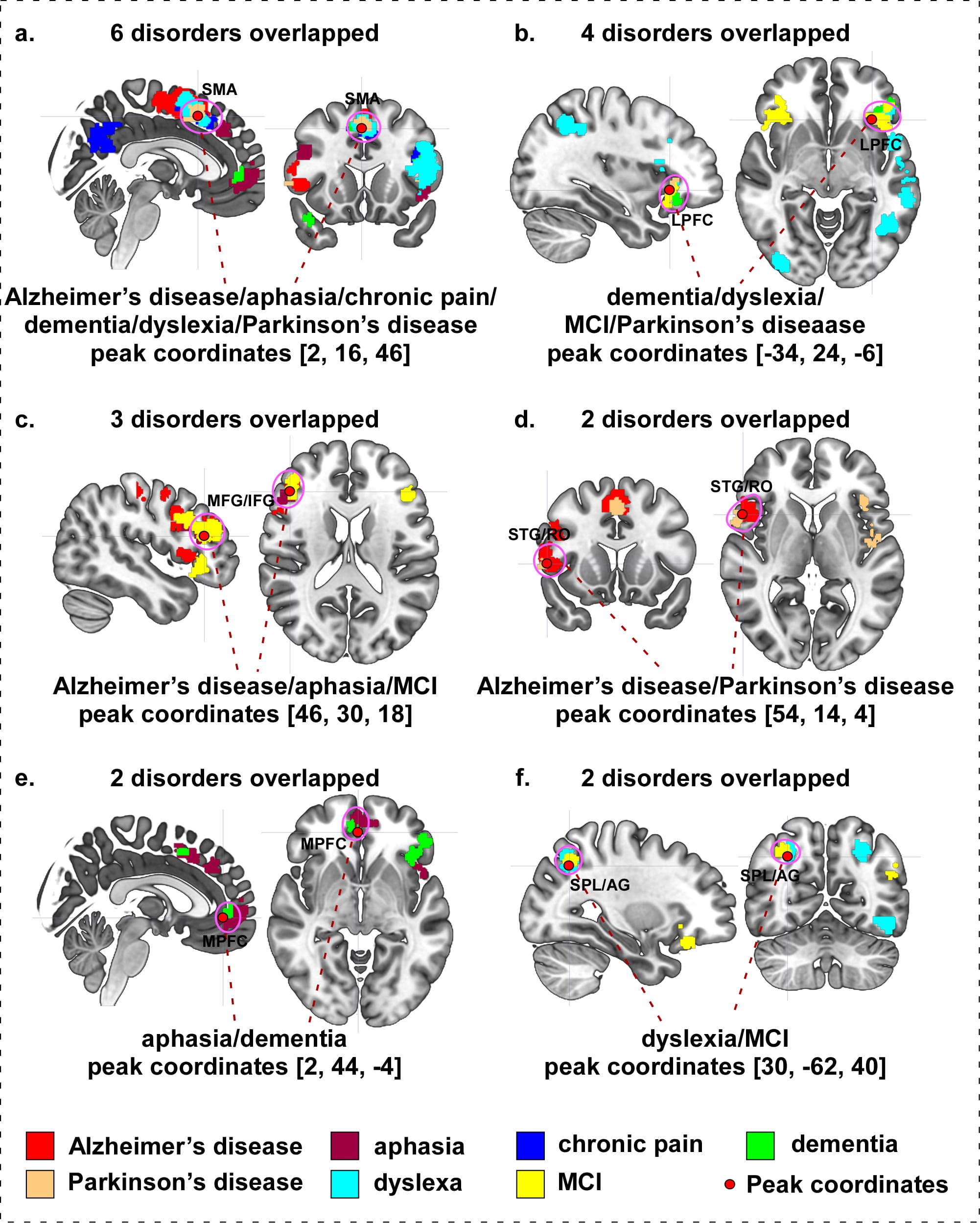 We investigated overlapping brain areas across different neurological disorders (see Table 8 and Fig. 9 for details). We found that: (a) Alzheimer’s disease, aphasia, chronic pain, dementia, dyslexia, and Parkinson’s disease show an overlap on the right supplementary motor area (SMA)/medial frontal gyrus (MedFG) (Fig. 9a); (b) the left lateral prefrontal cortex (LPFC) and inferior frontal gyrus (IFG)/orbital inferior frontal gyrus (OrbIFG) are involved in dementia, dyslexia, MCI and Parkinson’s disease (Fig. 9b); (c) the right middle frontal gyrus (MFG)/inferior frontal gyrus (IFG) are involved in Alzheimer’s disease, aphasia, and MCI (Fig. 9c); (d) Alzheimer’s disease and Parkinson’s disease display an overlap on the right superior temporal gyrus (STG)/Rolandic operculum (RO) (Fig. 9d); (e) the right medial prefrontal cortex (MPFC) are associated with aphasia and dementia (Fig. 9e); and (f) the right superior parietal lobule (SPL)/angular gyrus (AG) are involved in dyslexia and MCI (Fig. 9f).