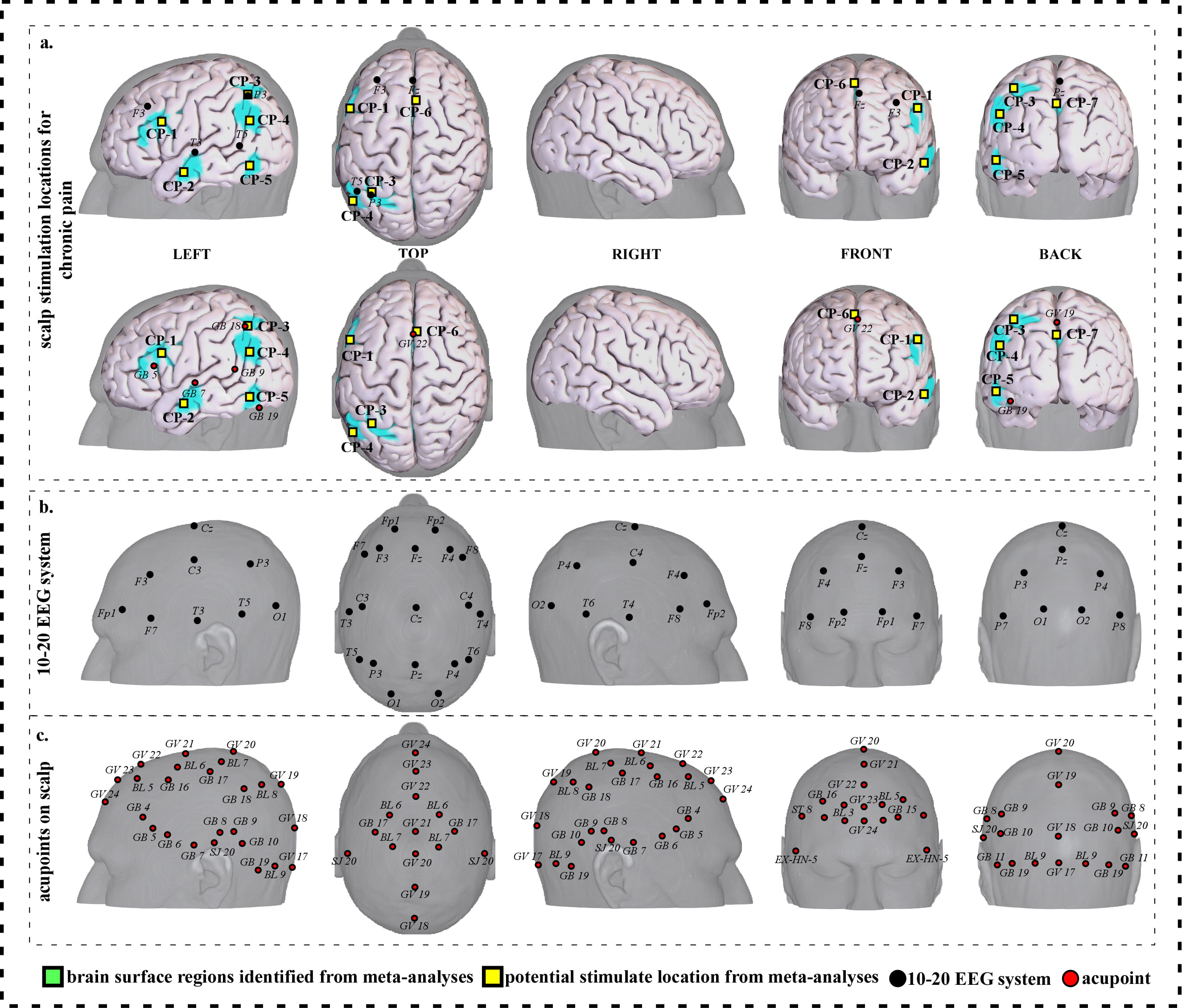 Fig. 4.Neuroimaging-based scalp stimulation protocols for chronic pain. (a) Scalp stimulation locations for chronic pain. Upper and lower panels of a to g. applied the 10–20 EEG system, and international acupoints, respectively, to facilitate identifying the locations. (b) 10–20 EEG system locations. (c) Acupoint locations. Abbreviations: AD, Alzheimer’s disease; GV 17, Naohu; GV 18, Qiangjian; GV 19, Houding; GV 20, Baihui; GV 21, Qianding; GV 22, Xinhui; GV 23, Shangxing; GV 24, Shenting; GB 4, Hanyan; GB 5, Xuanlu; GB 6, Xuanli; GB 7, Qubin; GB 8, Shuaigu; GB 9, Tianchong; GB 10, Fubai; GB 11, Touqiaoyin; GB 15, Toulinqi; GB 16, Muchuang; GB 17, Zhengying; GB 18, Chengling; GB 19, Naokong; BL 5, Wuchu; BL 6, Chengguang; BL 7, Tongtian; BL 8, Luoque; BL 9, Yuzhen; SJ 20, Jiaosun; ST 8, Touwei; EX-HN-5, Taiyang.