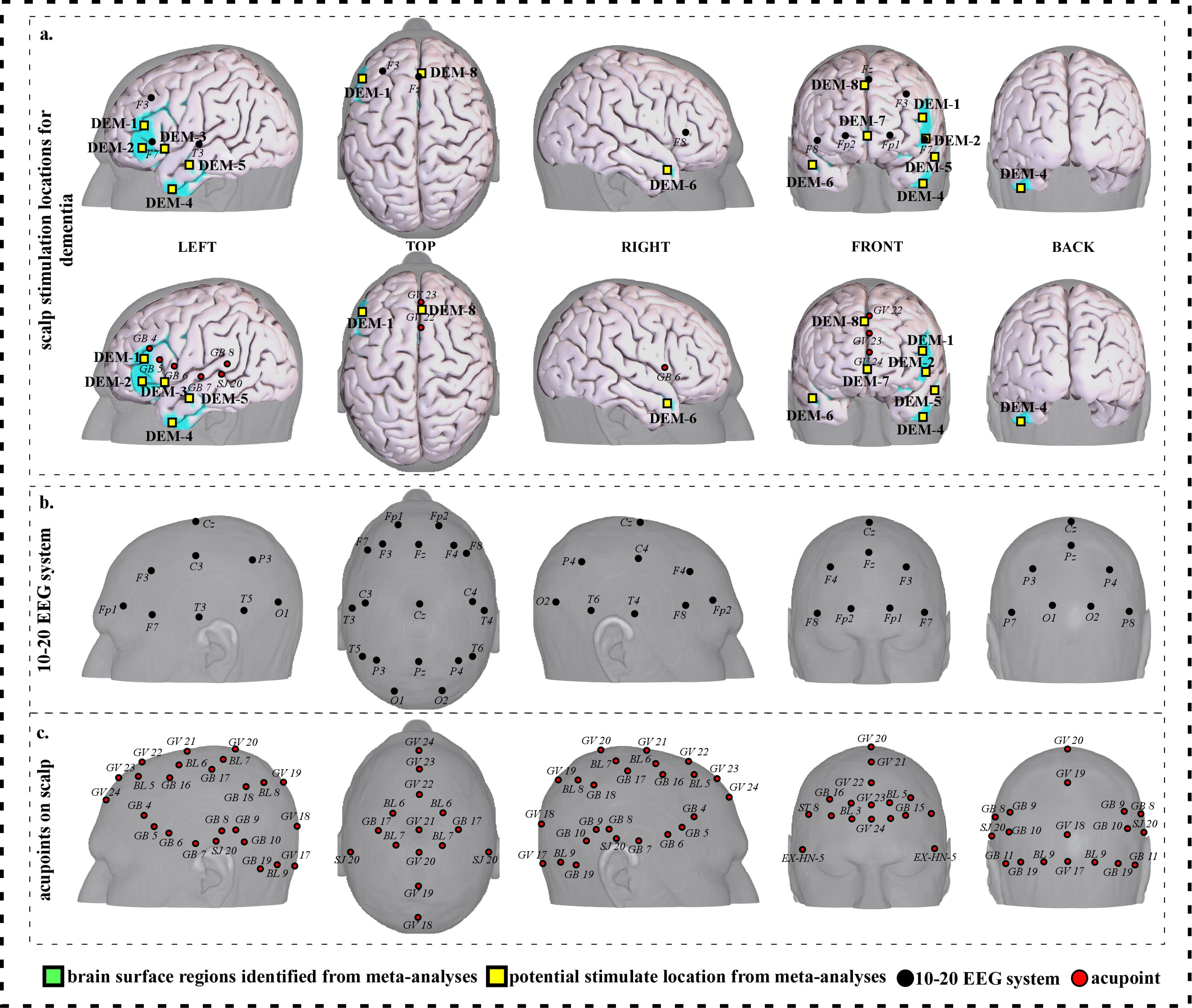 Fig. 5.Neuroimaging-based scalp stimulation protocols for dementia. (a) Scalp stimulation locations for dementia. Upper and lower panels of a to g. applied the 10–20 EEG system, and international acupoints, respectively, to facilitate identifying the locations. (b) 10–20 EEG system locations. (c) Acupoint locations. Abbreviations: AD, Alzheimer’s disease; GV 17, Naohu; GV 18, Qiangjian; GV 19, Houding; GV 20, Baihui; GV 21, Qianding; GV 22, Xinhui; GV 23, Shangxing; GV 24, Shenting; GB 4, Hanyan; GB 5, Xuanlu; GB 6, Xuanli; GB 7, Qubin; GB 8, Shuaigu; GB 9, Tianchong; GB 10, Fubai; GB 11, Touqiaoyin; GB 15, Toulinqi; GB 16, Muchuang; GB 17, Zhengying; GB 18, Chengling; GB 19, Naokong; BL 5, Wuchu; BL 6, Chengguang; BL 7, Tongtian; BL 8, Luoque; BL 9, Yuzhen; SJ 20, Jiaosun; ST 8, Touwei; EX-HN-5, Taiyang.