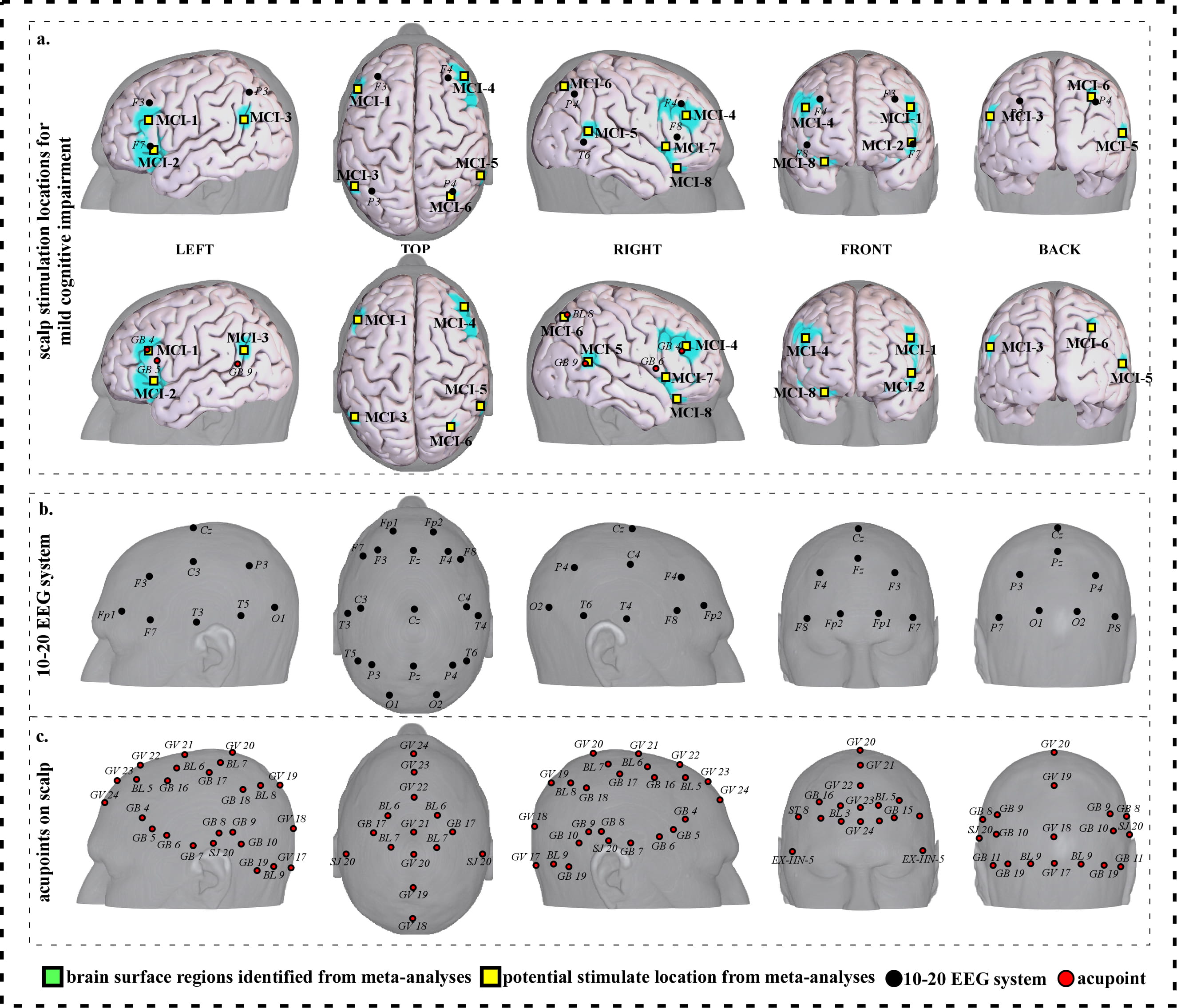 Fig. 7.Neuroimaging-based scalp stimulation protocols for mild cognitive impairment. (a) Scalp stimulation locations for mild cognitive impairment. Upper and lower panels of a to g. applied the 10–20 EEG system, and international acupoints, respectively, to facilitate identifying the locations. (b) 10–20 EEG system locations. (c) Acupoint locations. Abbreviations: AD, Alzheimer’s disease; GV 17, Naohu; GV 18, Qiangjian; GV 19, Houding; GV 20, Baihui; GV 21, Qianding; GV 22, Xinhui; GV 23, Shangxing; GV 24, Shenting; GB 4, Hanyan; GB 5, Xuanlu; GB 6, Xuanli; GB 7, Qubin; GB 8, Shuaigu; GB 9, Tianchong; GB 10, Fubai; GB 11, Touqiaoyin; GB 15, Toulinqi; GB 16, Muchuang; GB 17, Zhengying; GB 18, Chengling; GB 19, Naokong; BL 5, Wuchu; BL 6, Chengguang; BL 7, Tongtian; BL 8, Luoque; BL 9, Yuzhen; SJ 20, Jiaosun; ST 8, Touwei; EX-HN-5, Taiyang.