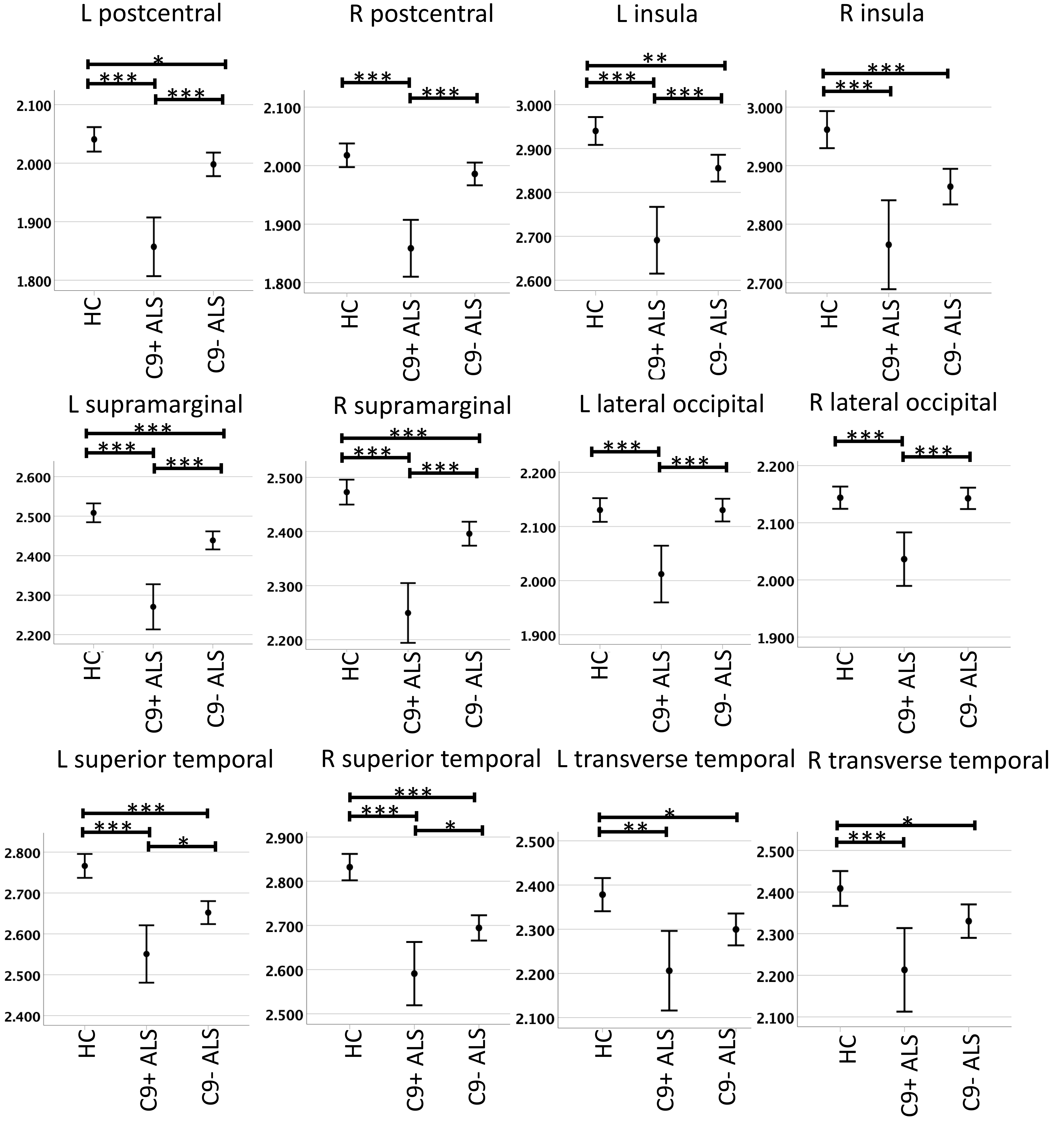 While ALS is primarily associated with motor and frontotemporal dysfunction [76, 77, 78, 79, 80], we have demonstrated the degeneration of anatomical structures involved in somatosensory, visual and auditory processing. Both cortical volumes and cortical thickness were significantly reduced in the postcentral, insular, supramarginal, lateral occipital, superior temporal and transverse temporal cortices bilaterally in C9+ ALS patients in comparison to healthy controls. Bilateral insular, supramarginal, superior temporal and transverse temporal as well as left postcentral cortical thickness reductions were also observed in C9- ALS patients.