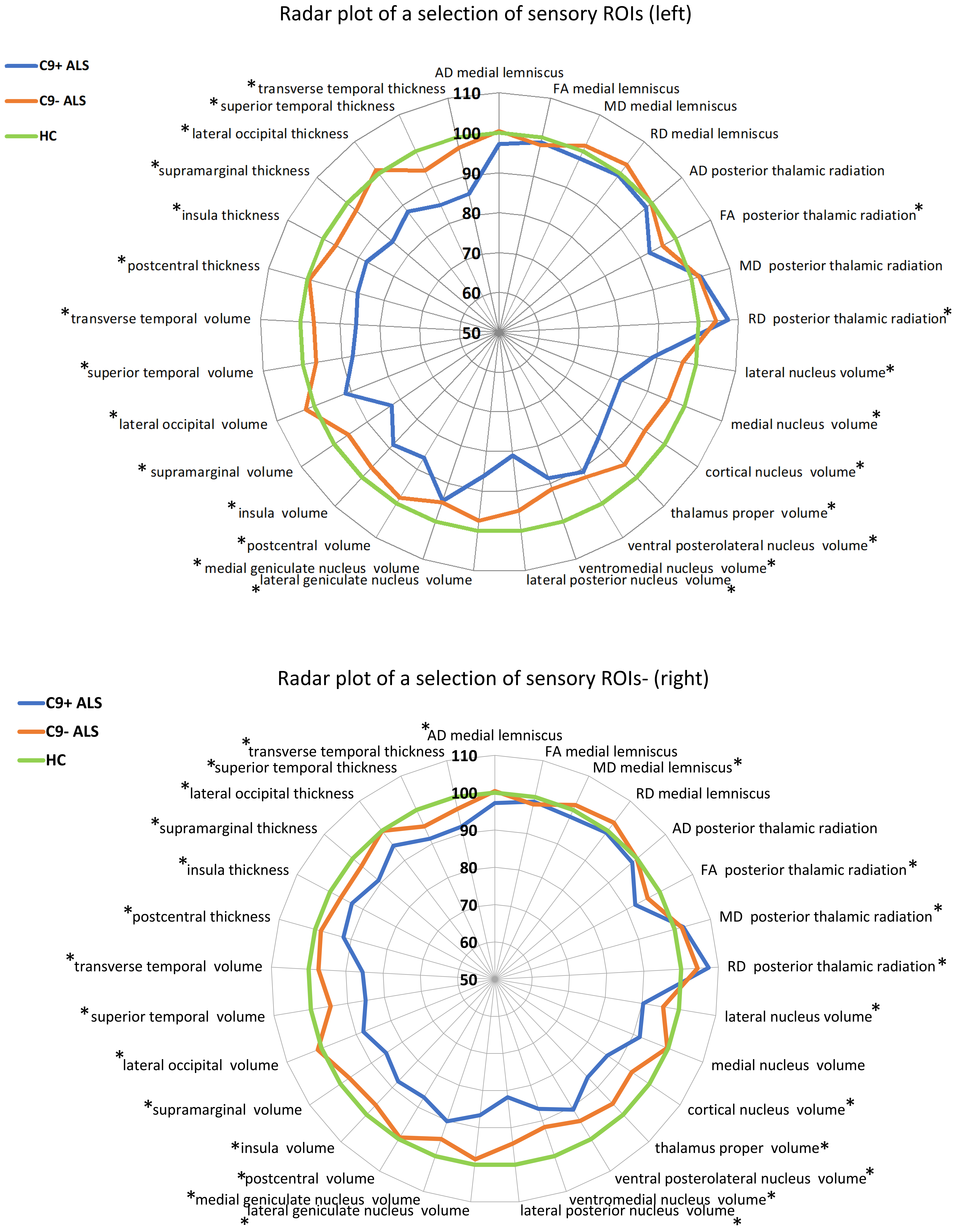 Assumptions of normality were examined using the Kolmogorov-Smirnov test. Skewness and kurtosis were assessed separately for each study group. Since all variables followed a normal distribution, parametric statistics were applied. The age and ALSFRS-r profile of the study groups were compared multivariate analysis of variance (MANOVA). Sex, symptom onset and handedness proportions in the study groups were contrasted using Pearson’s chi-squared test. White matter variables and cortical thickness measures were contrasted using multivariate analysis of covariance (MANCOVA) with age and sex and covariates. Volumetric profiles (cortical, thalamic nuclei, amygdalar nuclei) of the study groups were also appraised in MANCOVAs with the following covariates, age, sex and total intracranial volume (TIV). Bonferroni corrections were used to account for multiple comparisons and reduce Type I error. Output statistics were summarised in comprehensive tables to report estimated marginal means (EMM), standard error (SE), p-values and post hoc pairwise comparisons. To further illustrate focal pathology, radar plots were generated for the two patients groups where EMMs were expressed as the percentage of reference (HC) EMM in the given anatomical region.