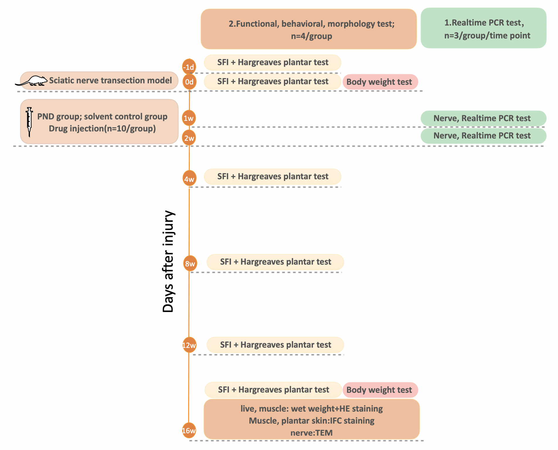 Fig. 1.Schematic diagram of the experimental procedure. On day 0, sciatic nerve transection was performed in all rats (n = 20). Following injury, the rats were randomly assigned to two groups: the PND group or the solvent control group (n = 10/group). All groups received an intraperitoneal injection of the corresponding medication for two consecutive weeks. Rats in the control group received 0.5 mL solvent daily, whereas rats in the PND group received 0.5 mL PND (10 mg/kg) daily. Then, in experiment 1, the rats were sacrificed at the indicated time points for the sampling of nerve tissues for real-time PCR (n = 3/group) analyses. In experiment 2, the walking track analysis (for evaluating motor function) along with the Hargreaves plantar test (for evaluating sensory function) were performed at the indicated time points (n = 4/group). After functional and behavioral tests were completed, the rats were weighed and sacrificed for the sampling of liver, nerve, muscle, and plantar skin tissues at 16 weeks for H&E staining, IF staining, and transmission electron microscopy (n = 4/group).