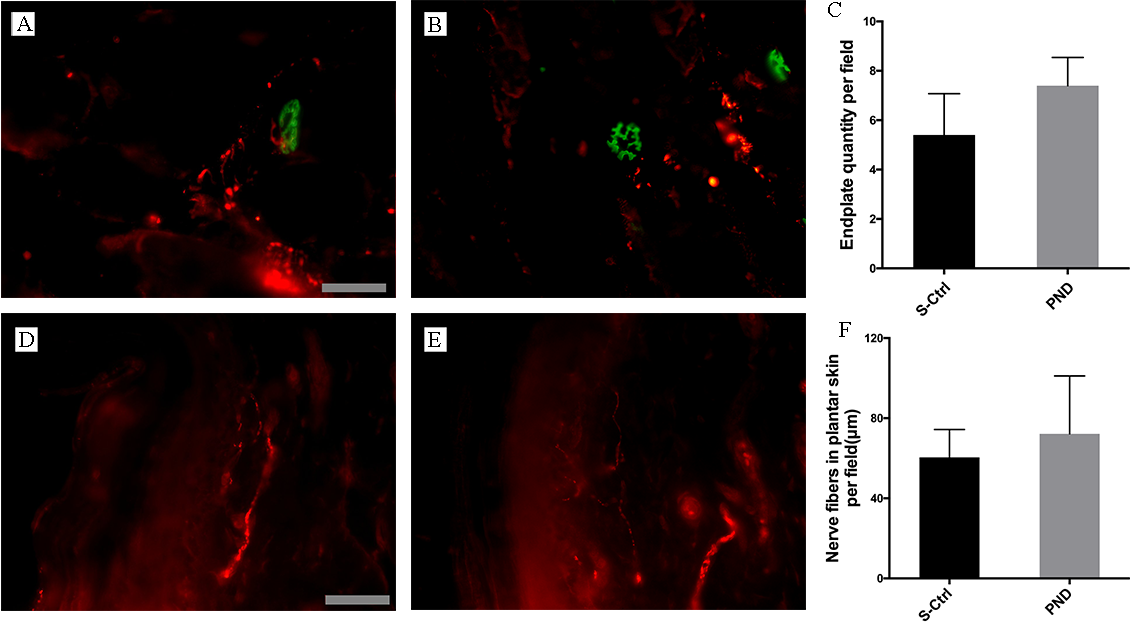 Both groups displayed regenerated nerve fiber ingrowth in the plantar skin, as
